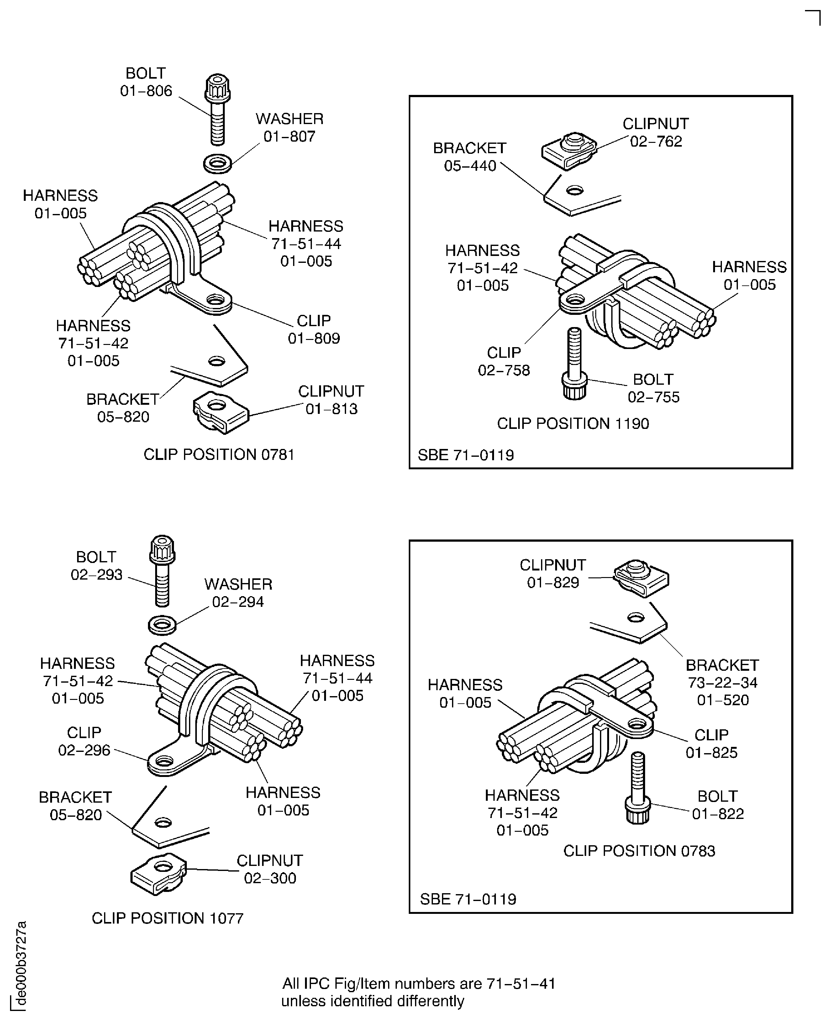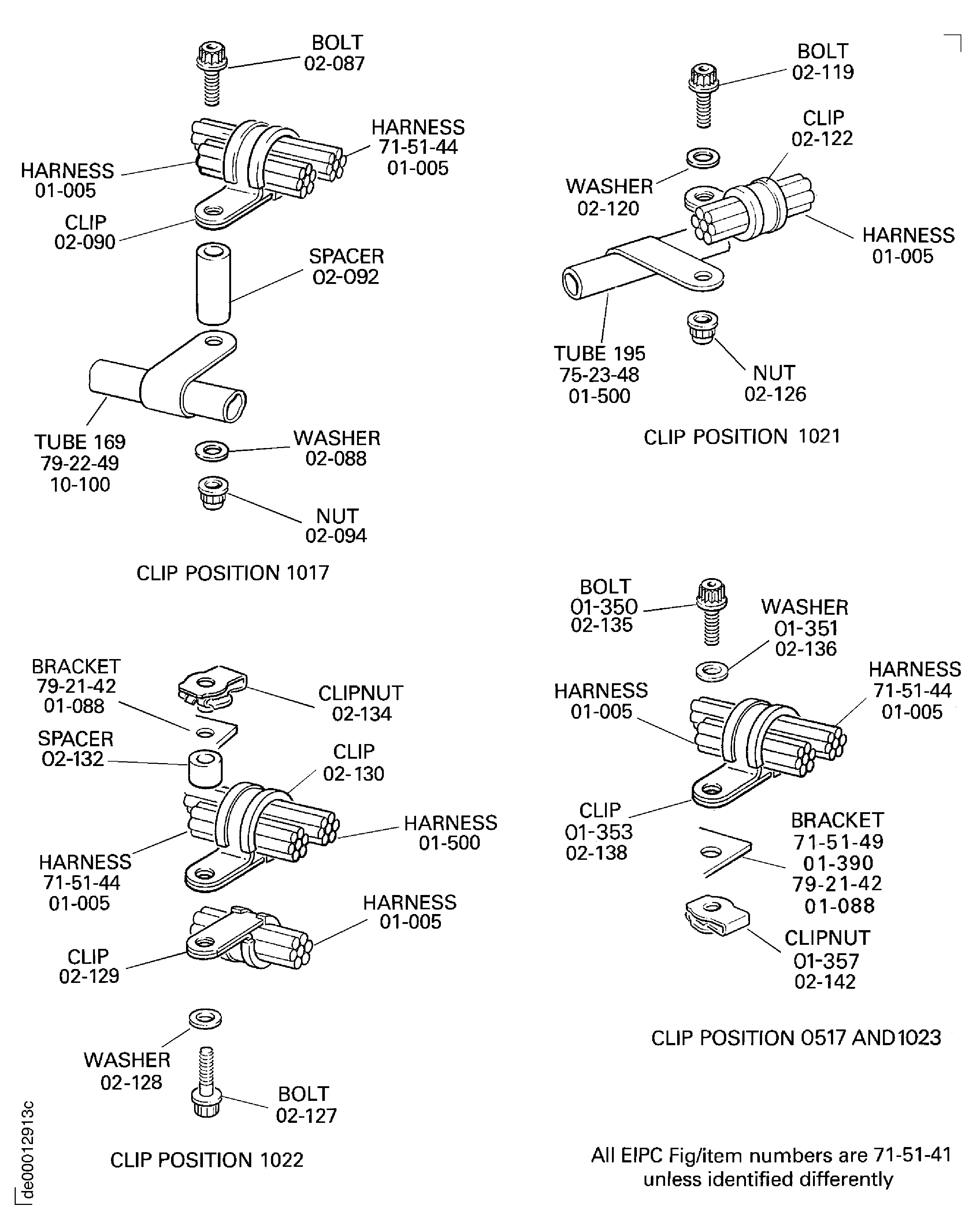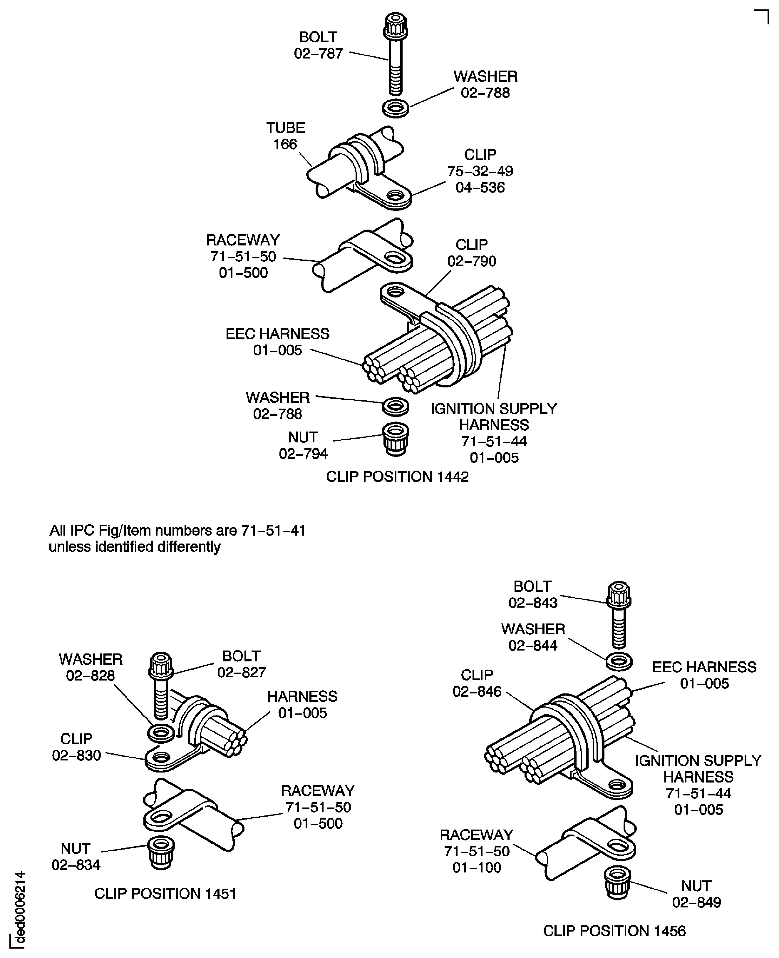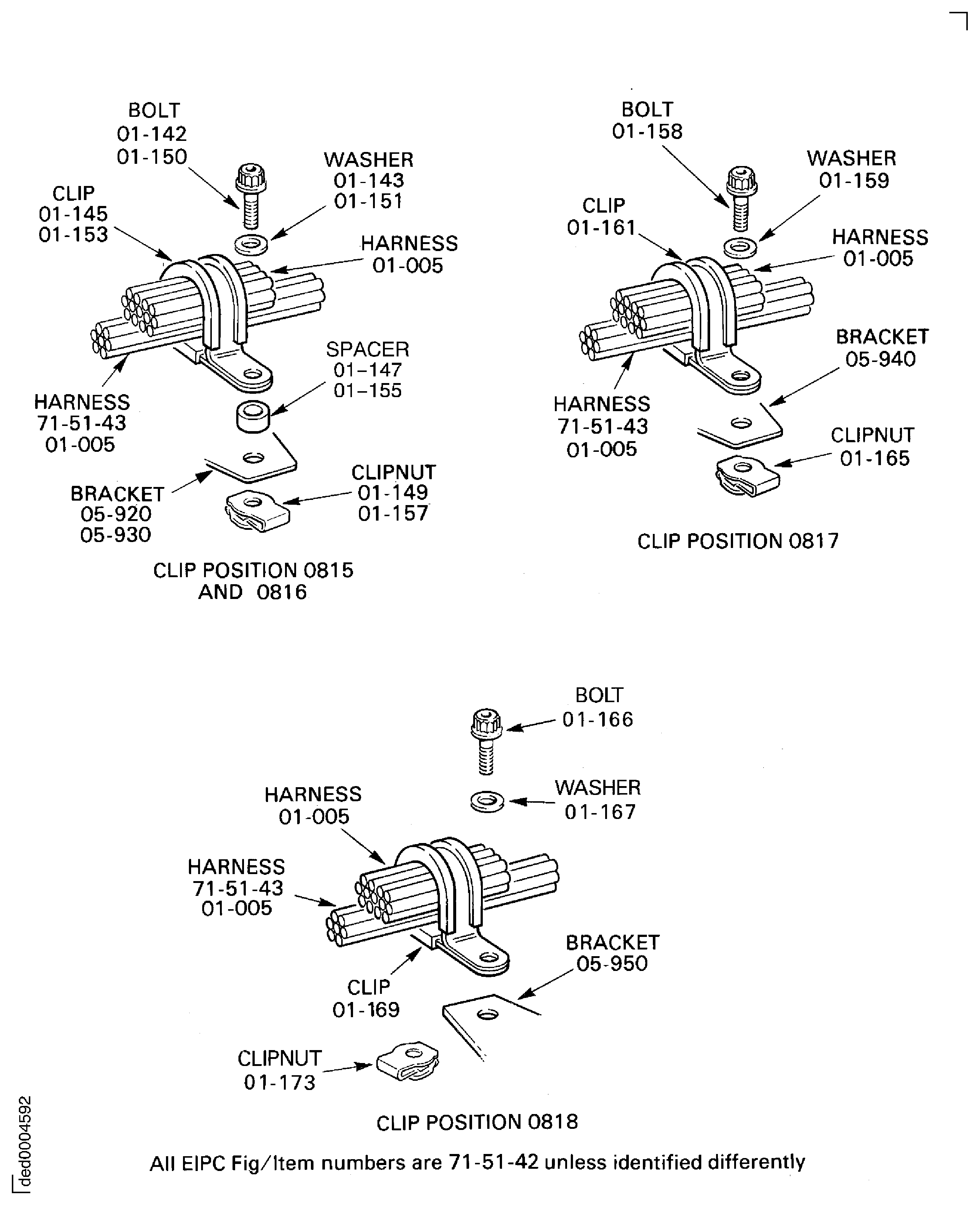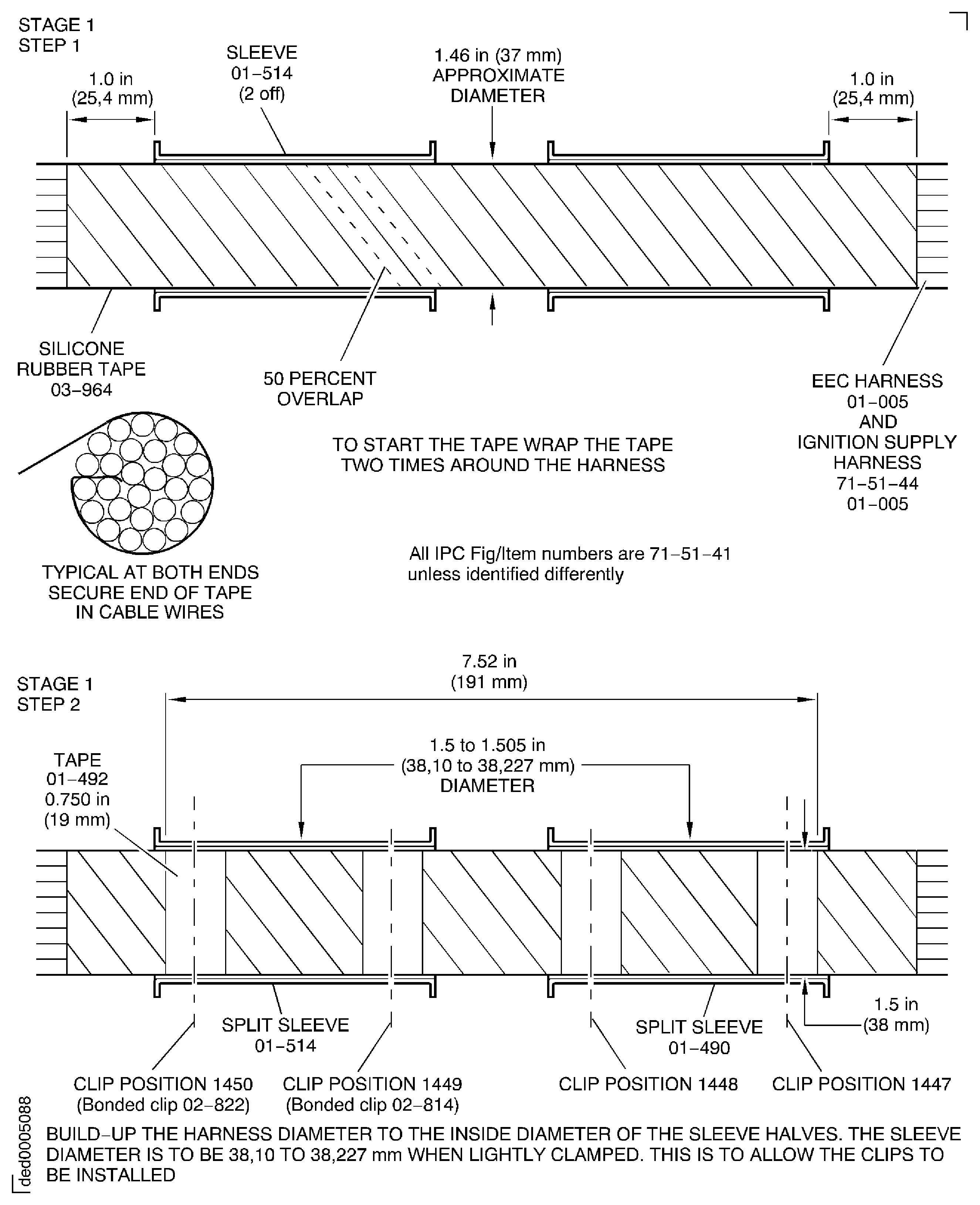 Because of the differences between the harness diameters, the specified clip could be too large or too small. You can use a clip from a range of six clips (that have the same part numbers) refer to the IPC (70-40-10). If the harness diameter is between two of the clips in the range, use the larger clip. When you do this use CoMat 02-148 ADHESIVE TAPE (ELECTRICAL) to increase the harness diameter.