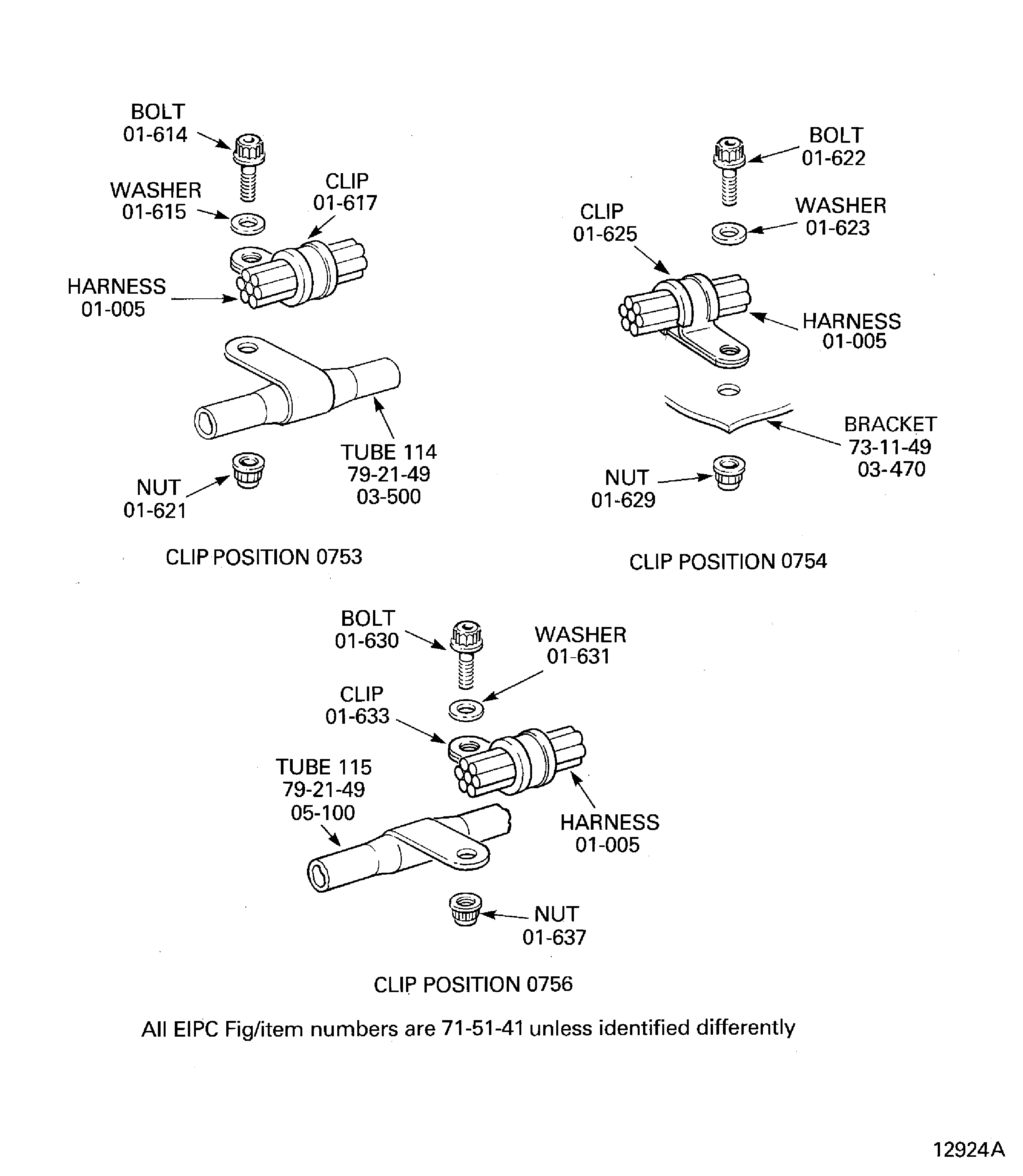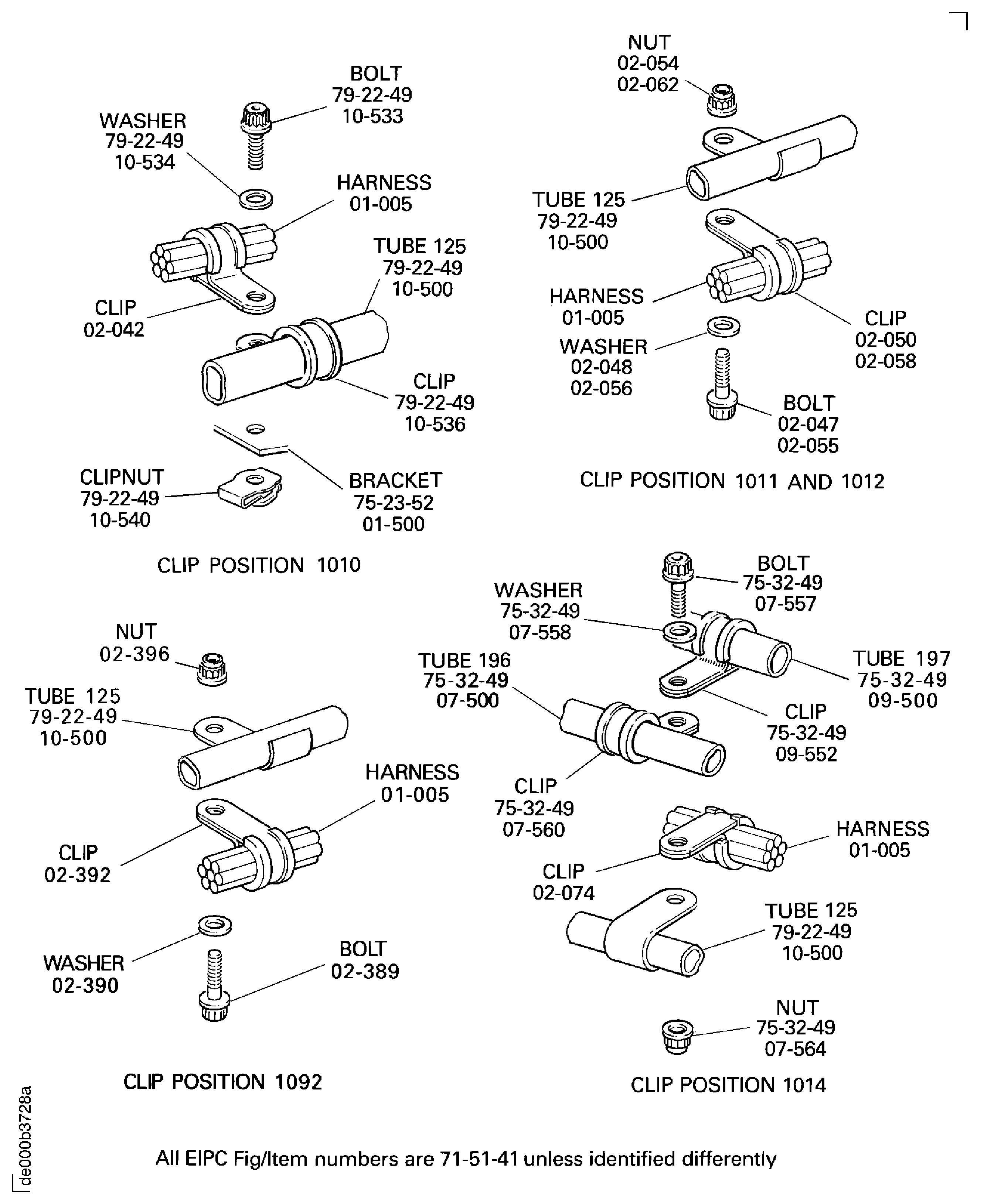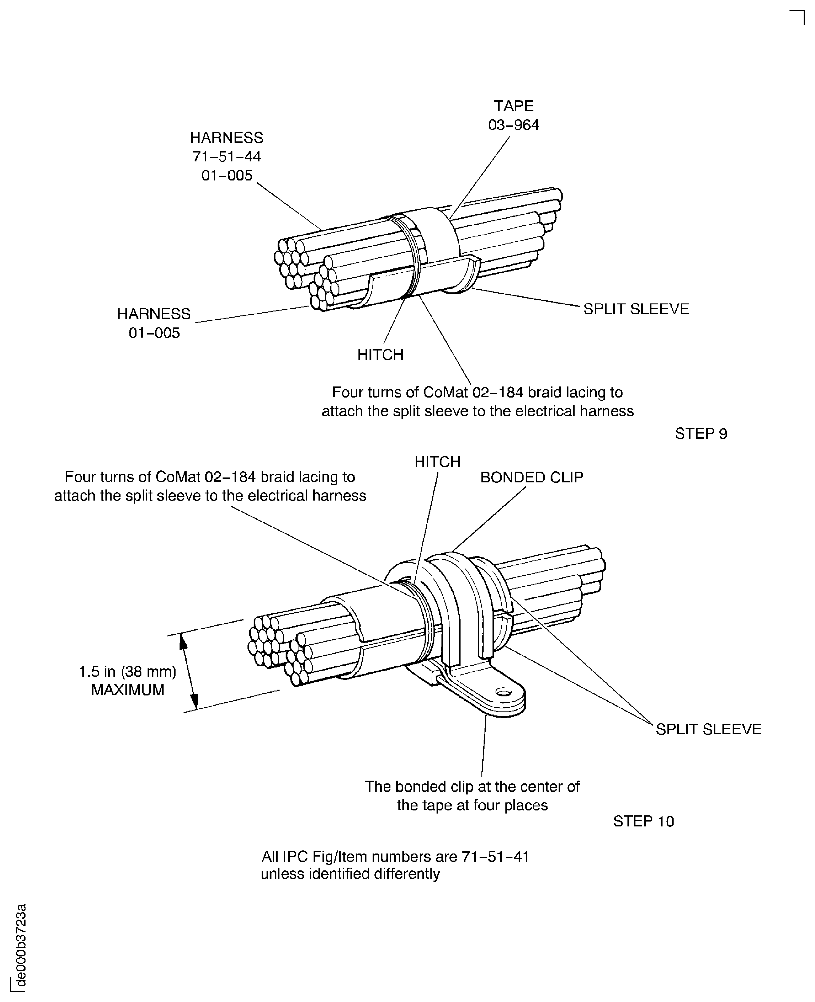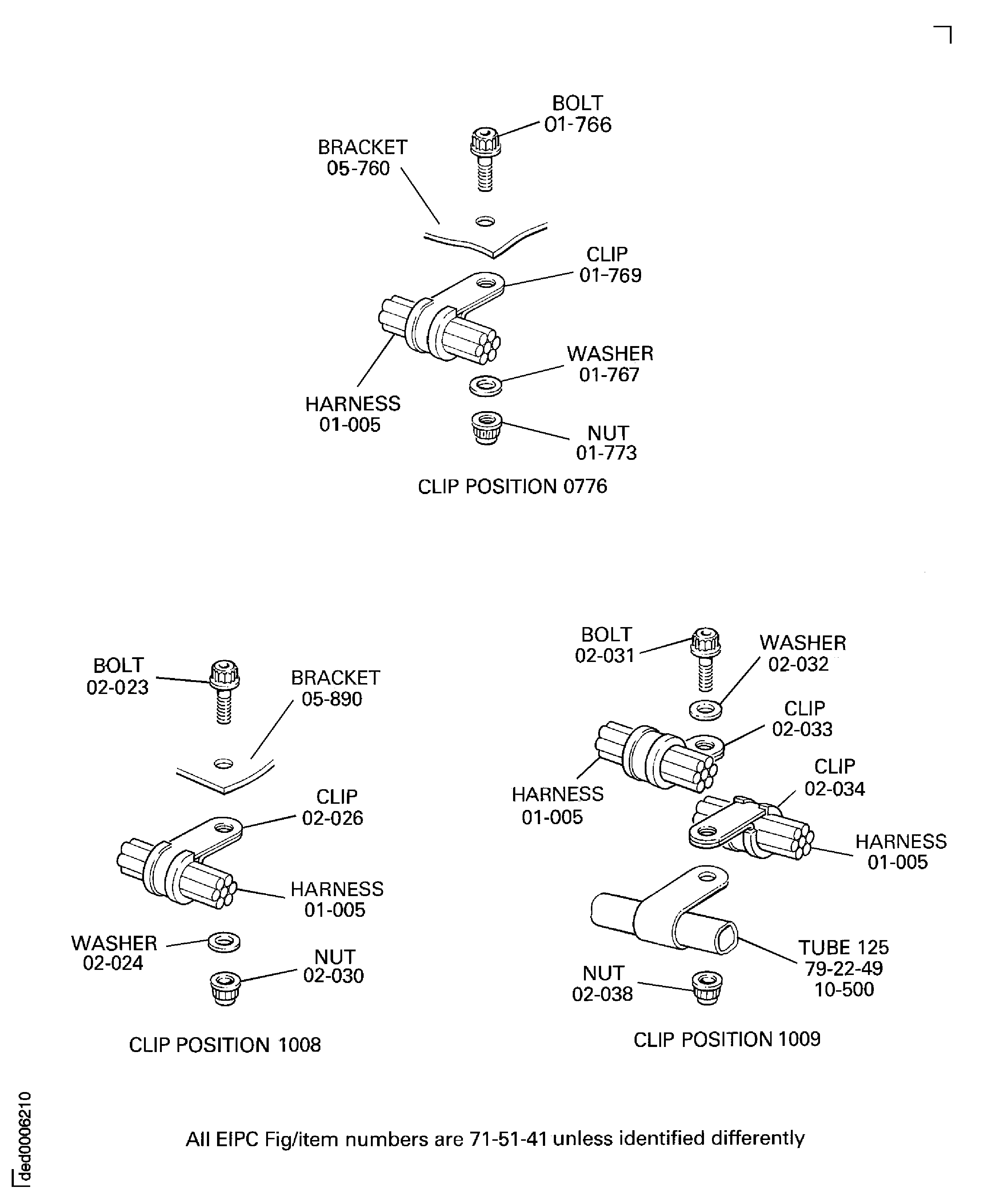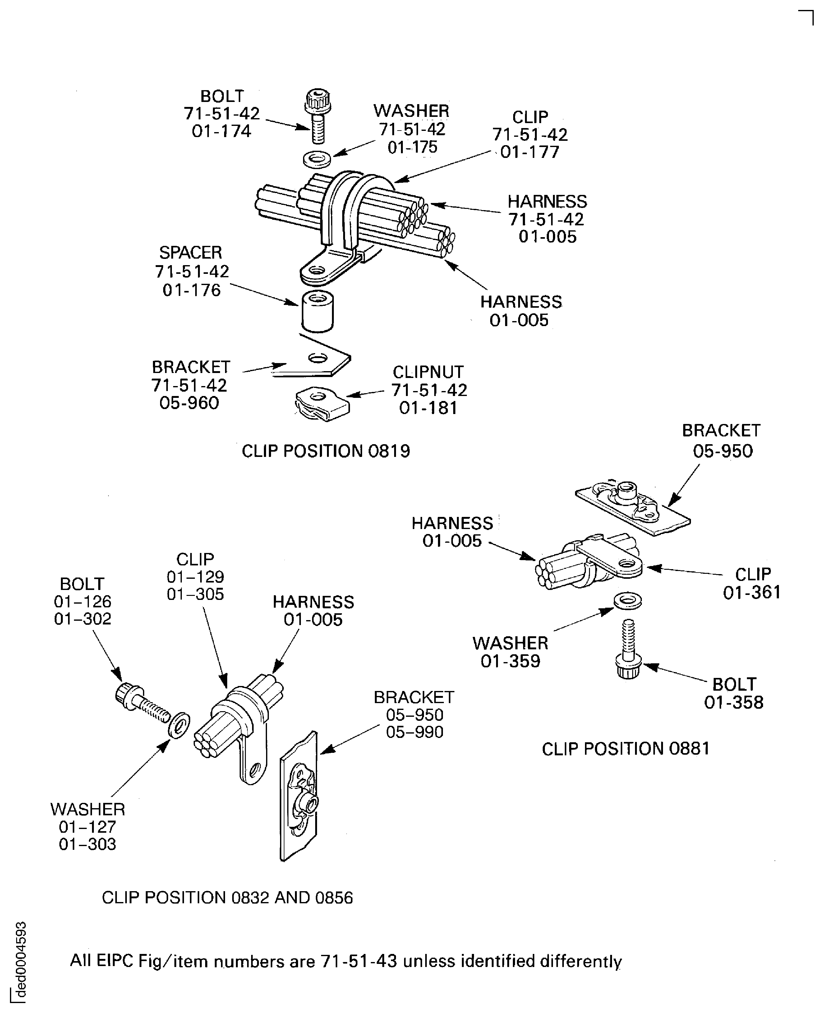 Because of the differences between the harness diameters, the specified clip could be too large or too small. You can use a clip from a range of six clips (that have the same part numbers) refer to the IPC (70-40-10). If the harness diameter is between two of the clips in the range, use the larger clip. When you do this use CoMat 02-148 ADHESIVE TAPE (ELECTRICAL) to increase the harness diameter.