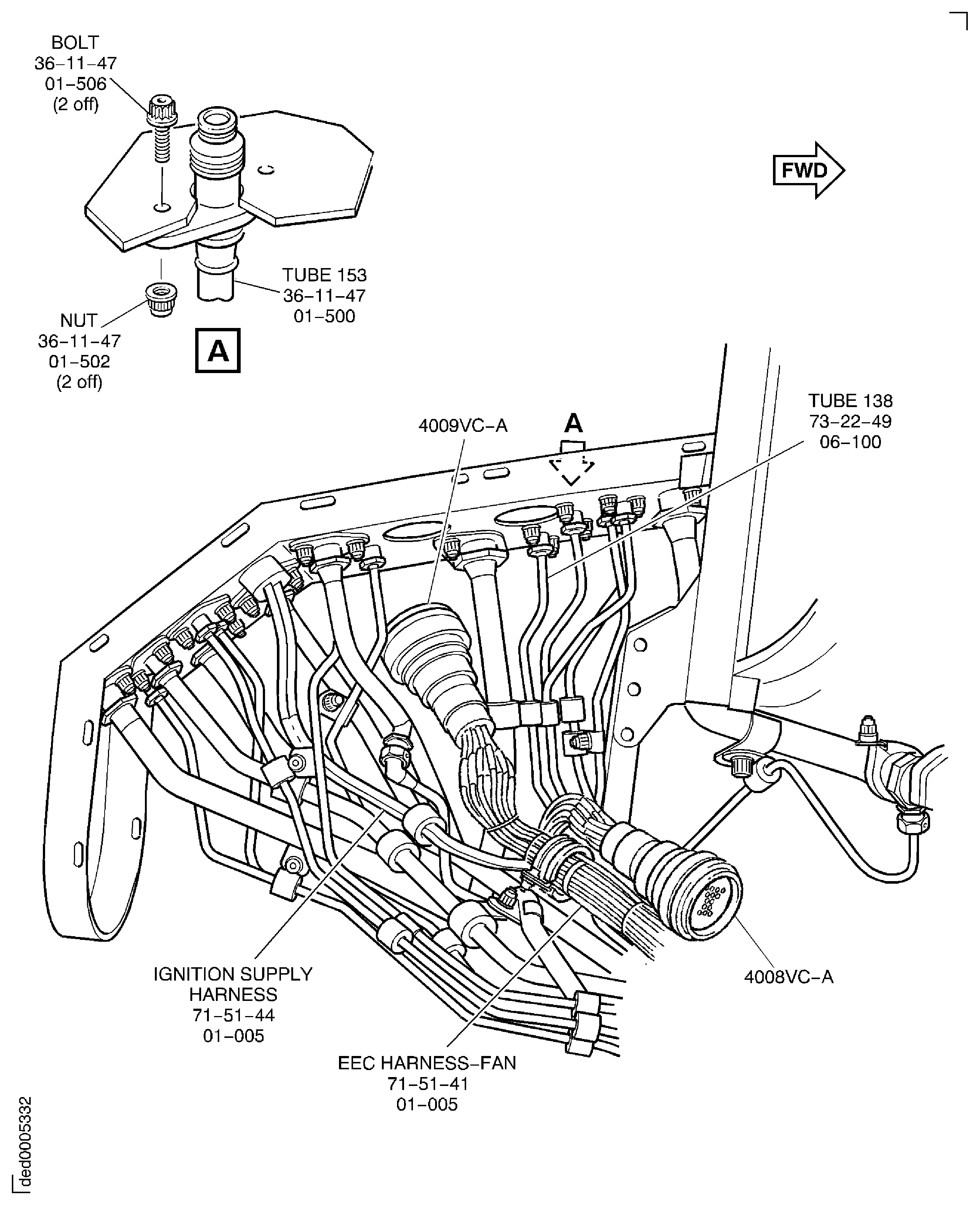 Attach the receptacle 4003VC to the bracket Fuel System Air Tubes (73-22-49, 03-800) with the four bolts and the four assembled washer nuts Ignition Supply Harness (71-51-44, 01-027 and Ignition Supply Harness (71-51-44, 01-025). Make sure the master keyway is in the outboard direction, refer to the detail on D, refer to Figure and Figure.
