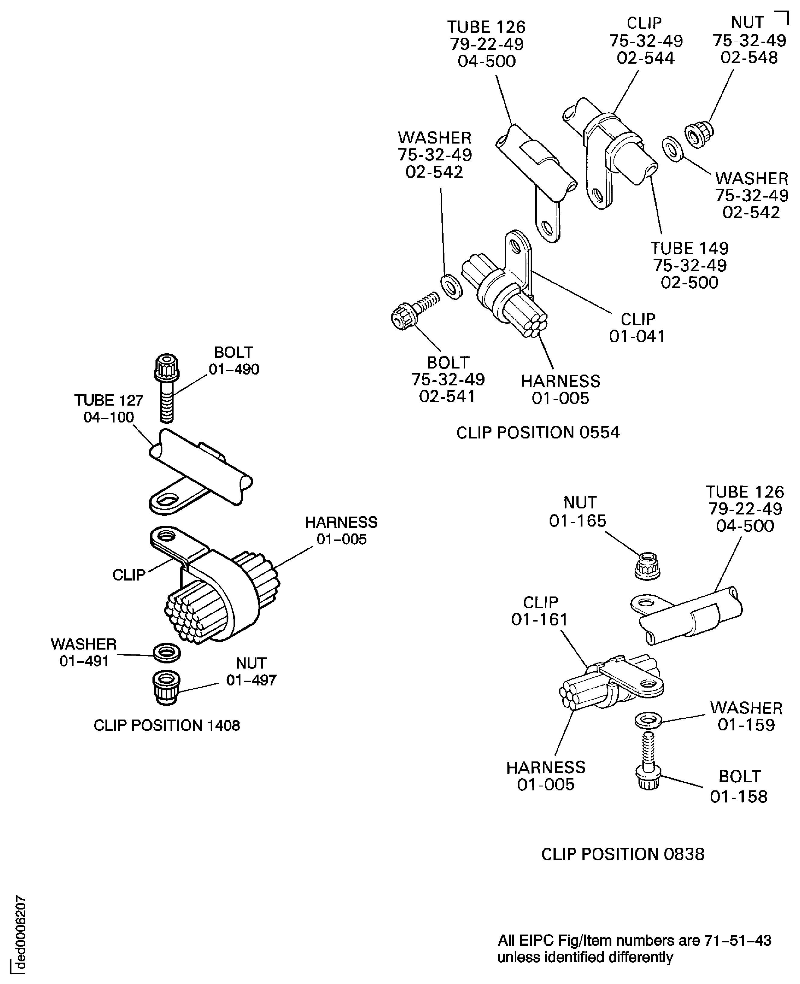 Remove the temporary ties and install the datum clip position 0550 and the clip position 0207, refer to Figure.