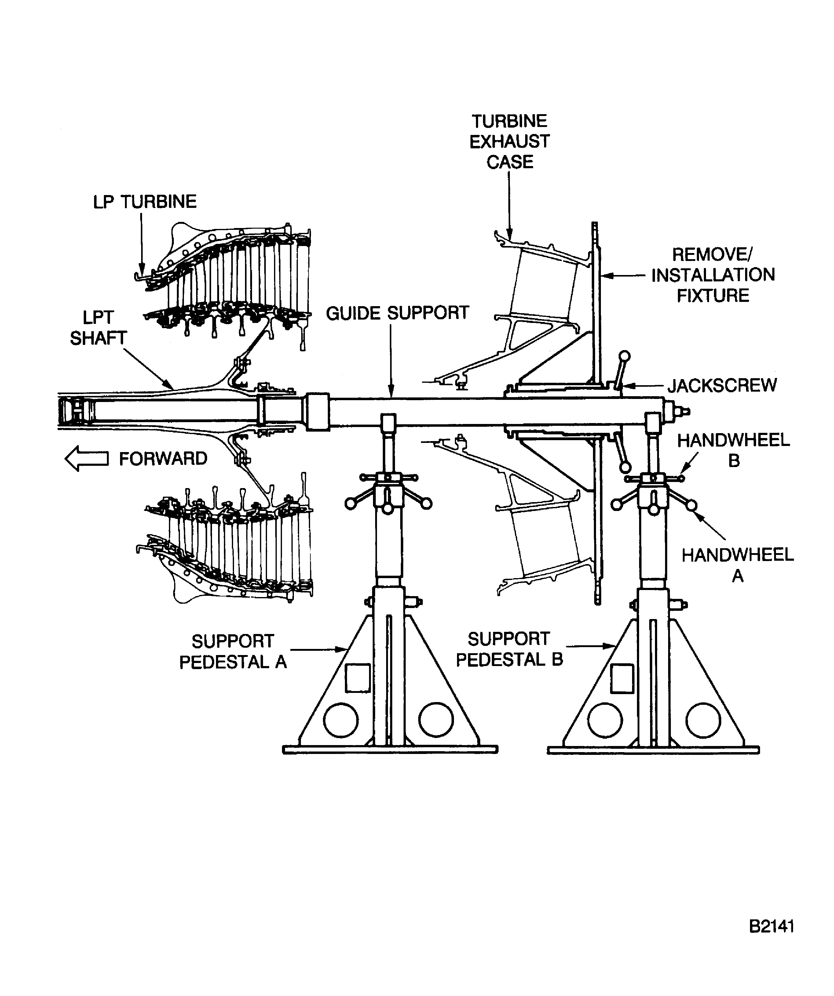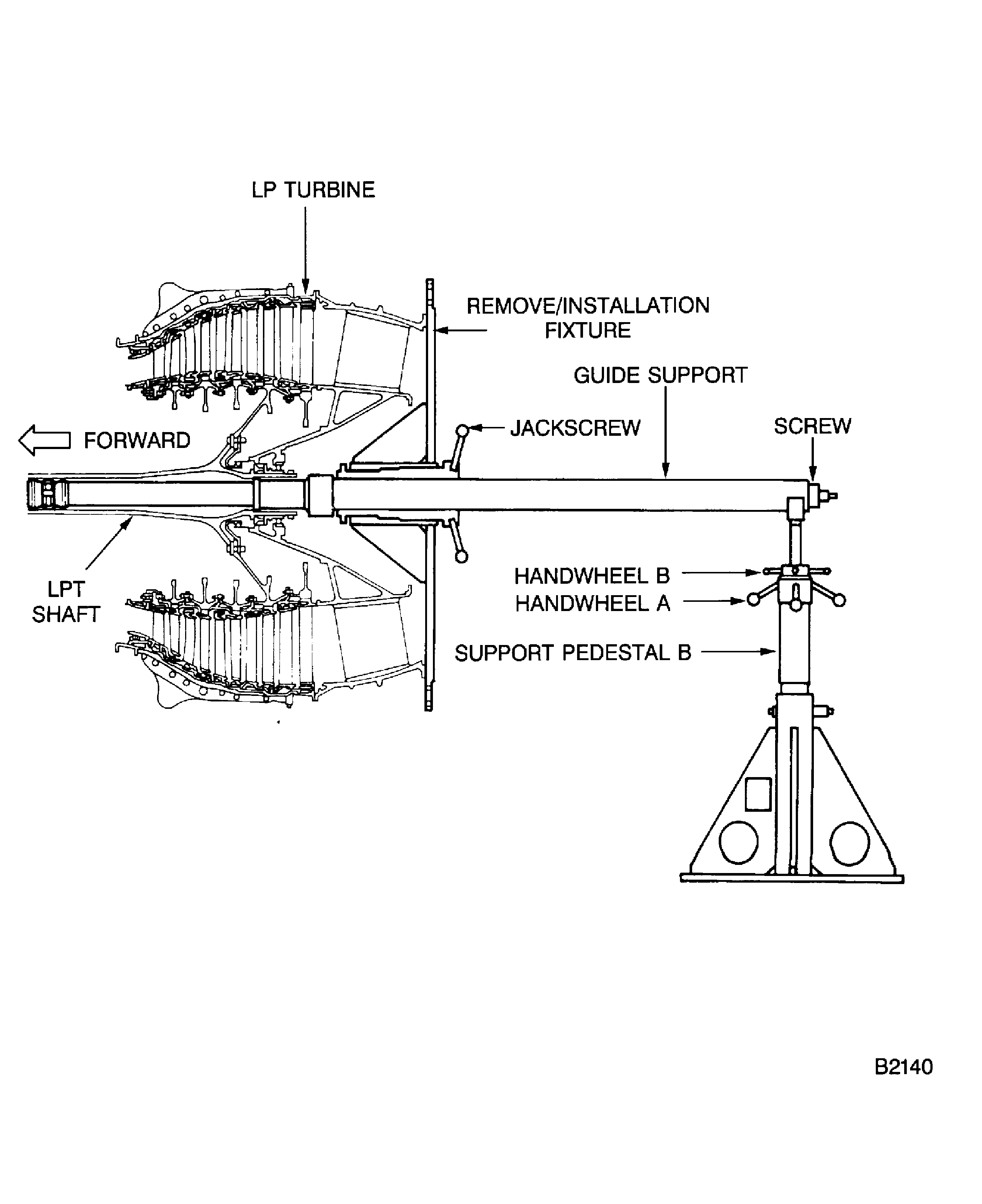 Put the IAE 1F10075 Support pedestal 1 off below the guide support near the rear flange of the LP turbine case. Refer to Step.