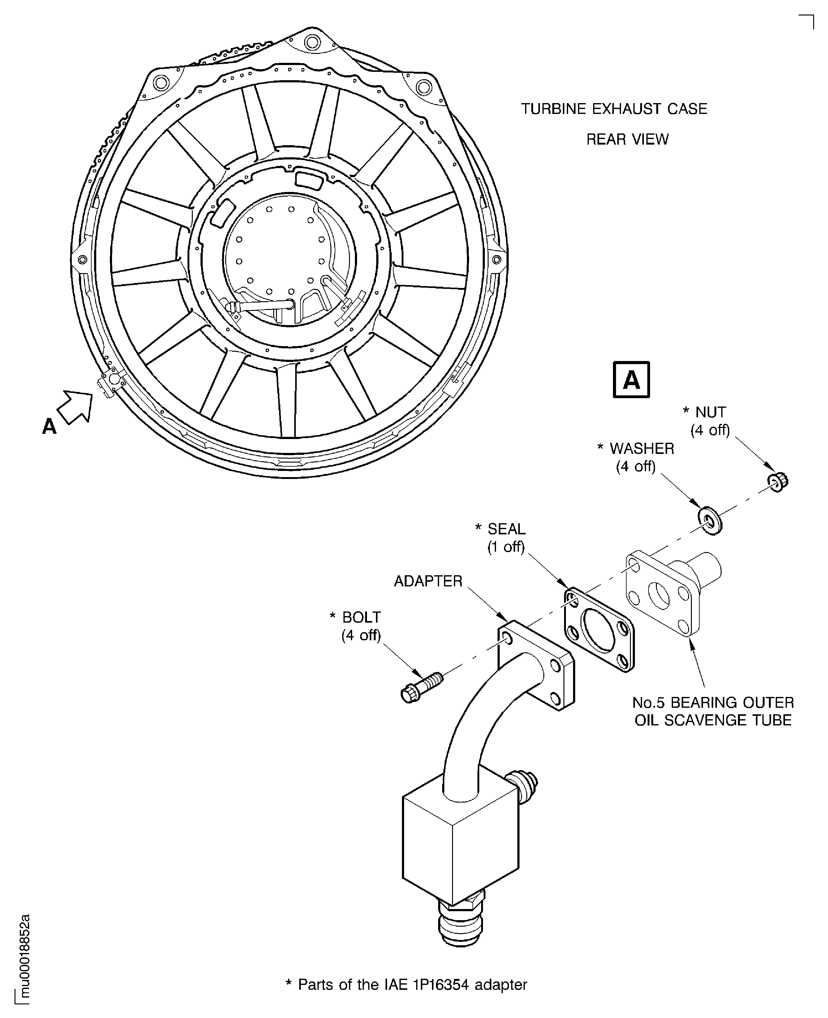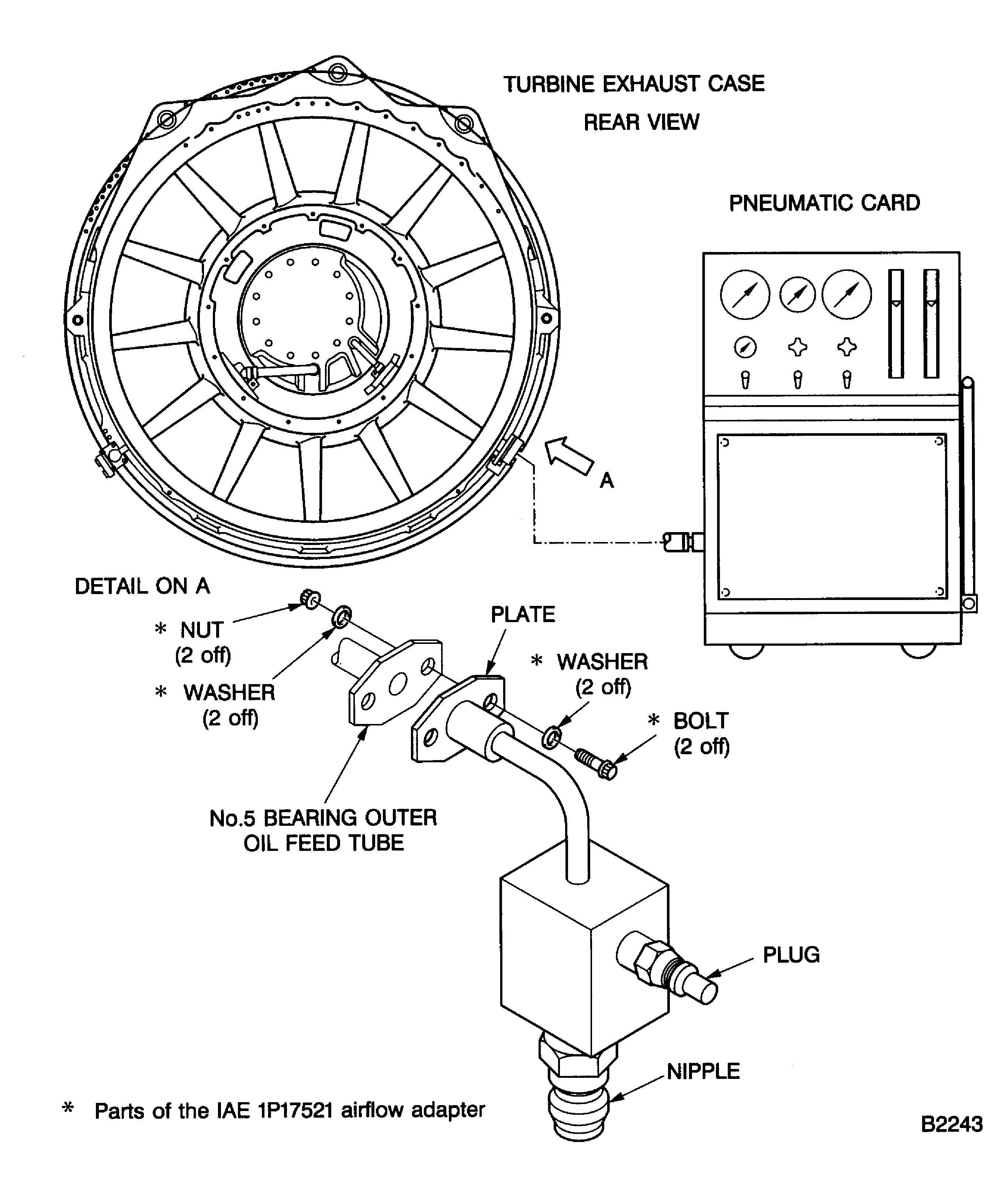 Install the IAE 1P16354 Vacuum Test Adapter to the No. 5 Bearing oil scavenge tube outlet with three bolts (part of the adapter). Tighten the bolts. Refer to Figure.