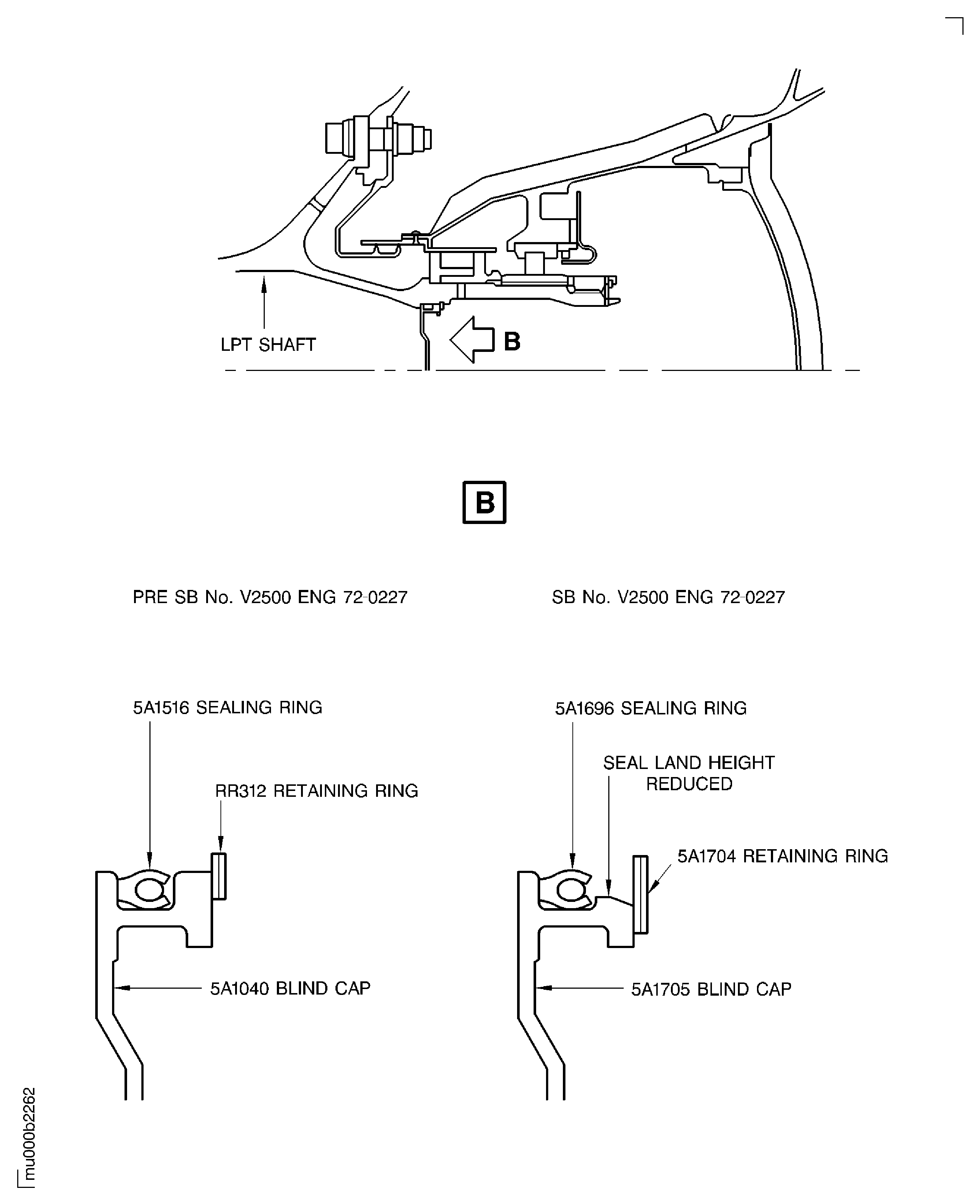 DO NOT USE THE INTERNAL RETAINING RING P/N RR312 WITH THE BLIND CAP P/N 5A1705.Install the internal retaining ring LPT Shaft And Related Parts (72-50-41, 01-100).