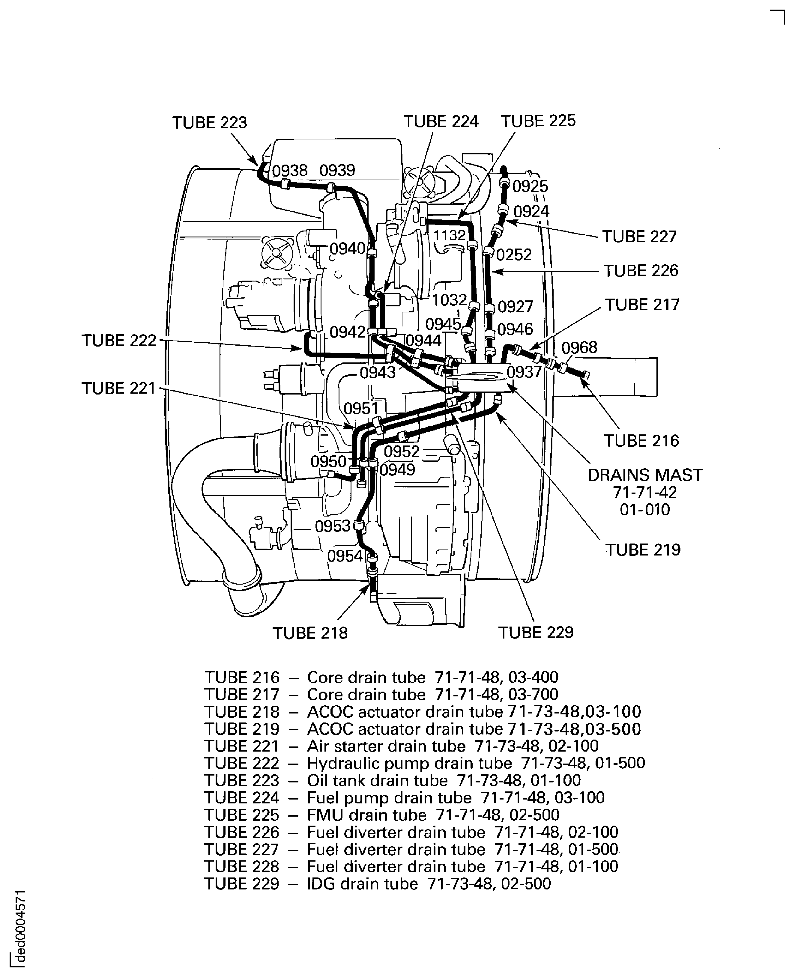 A minimum clearance of 0.02 in. (0.5 mm) is permitted between clip positions 0950 and 0951, between the gearbox and the air starter drain tube (221) and IDG drain tube (229).Install the air starter drain tube (221).