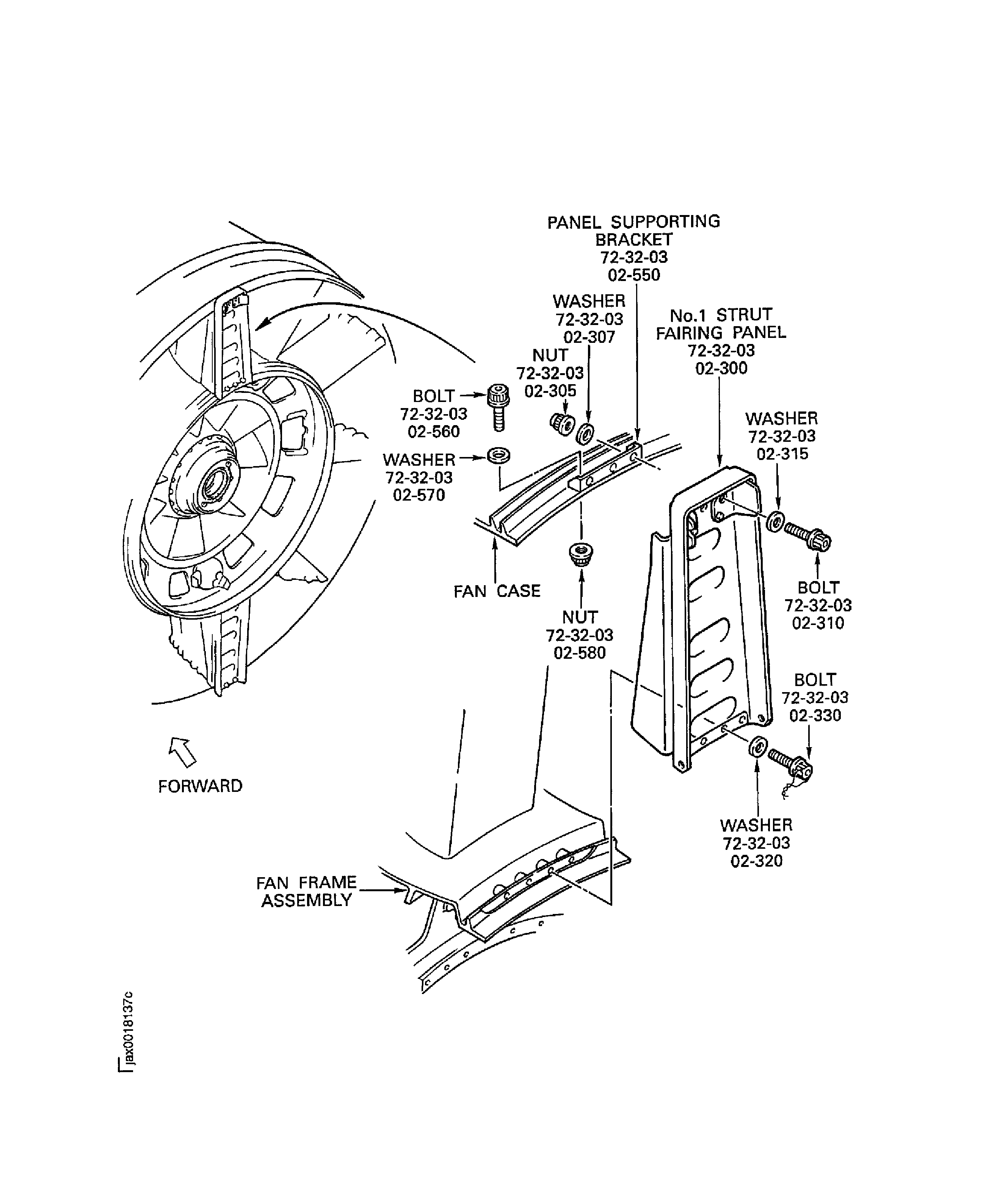 SUBTASK 72-32-00-030-221 Remove the No. 1 Strut Fairing Panel and the Panel Supporting Bracket from the Fan Frame Assembly and the Fan Case