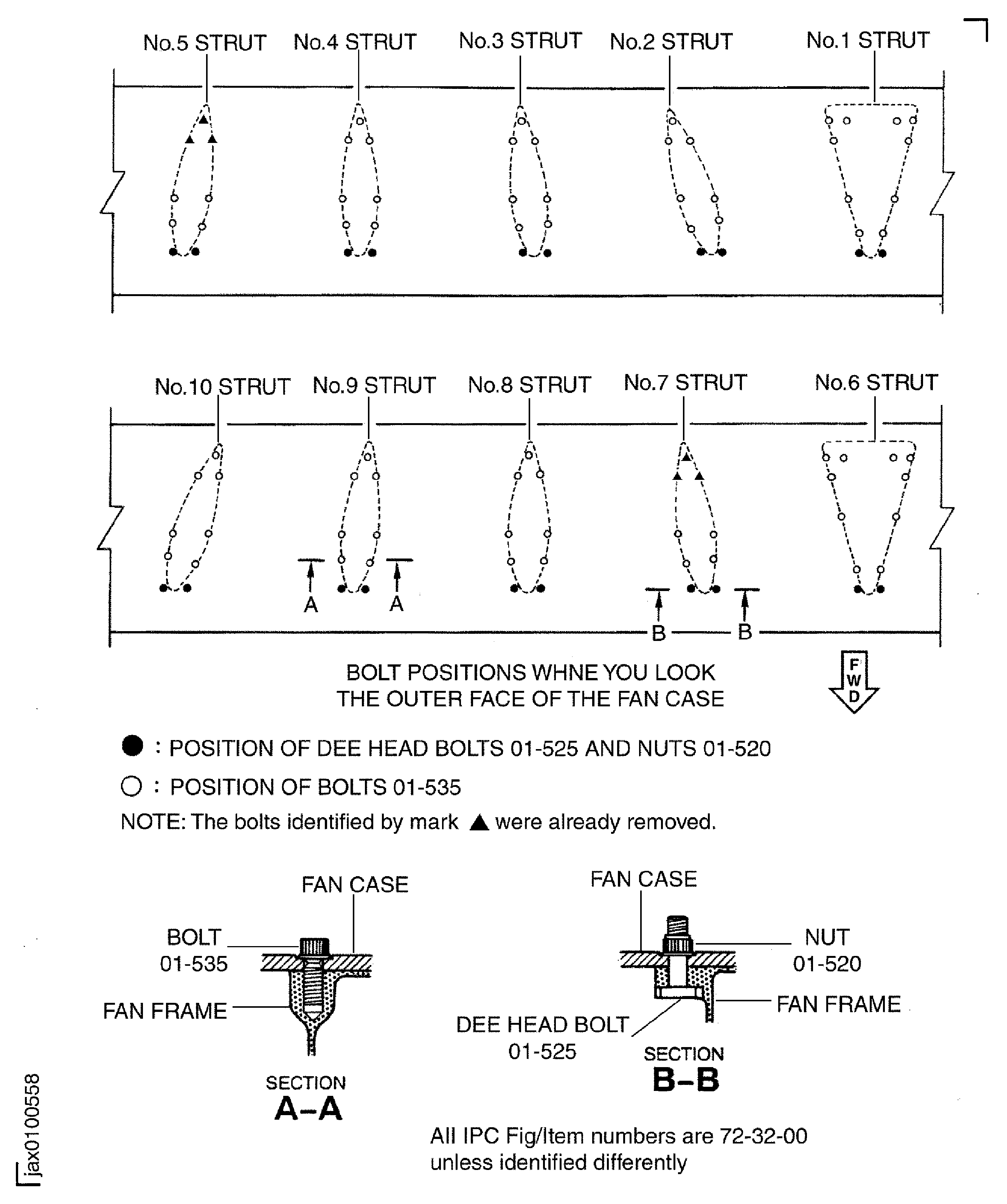 Figure: Pre SBE 72-0435: Position of the bolts to attach the fan frame to the fan case