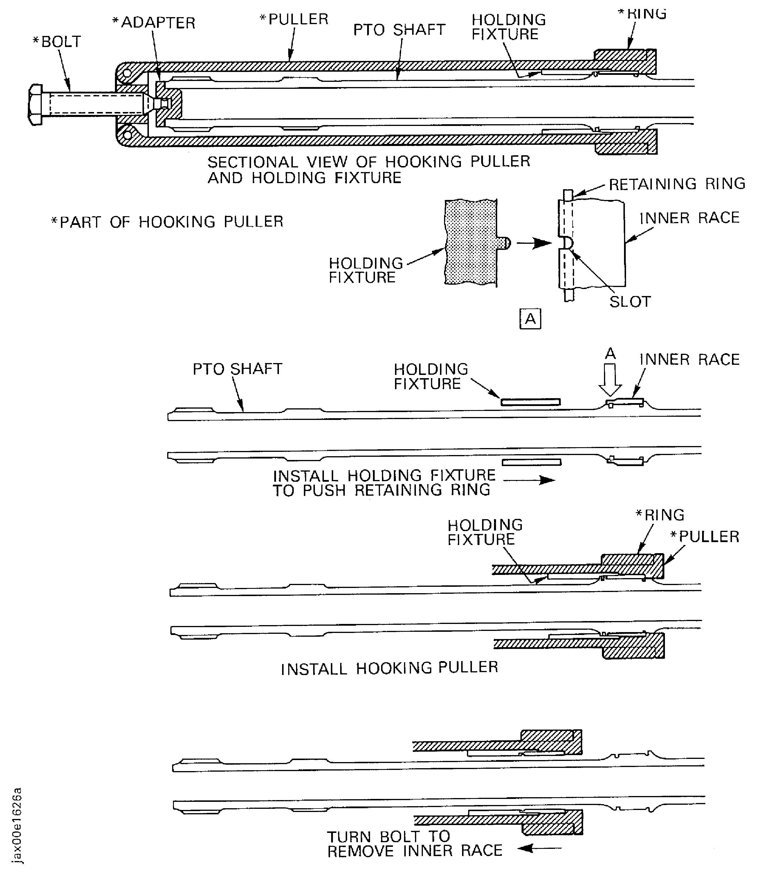 Install the IAE 1J12547 Hooking puller 1 off to the PTO shaft and inner race assembly.