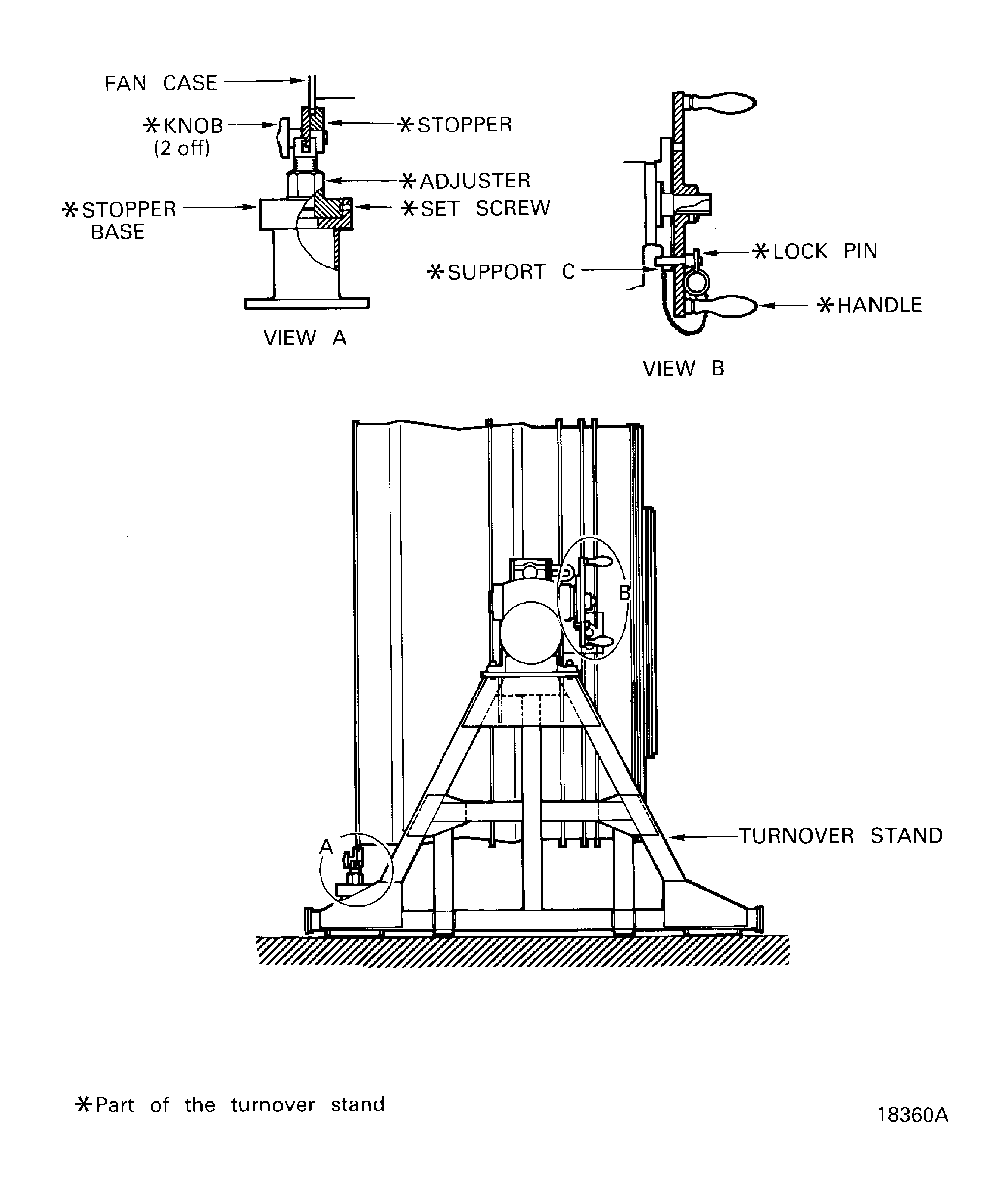 Remove the four bolts and washers which attach each plate to the supports A and B of the turnover stand, Figure.