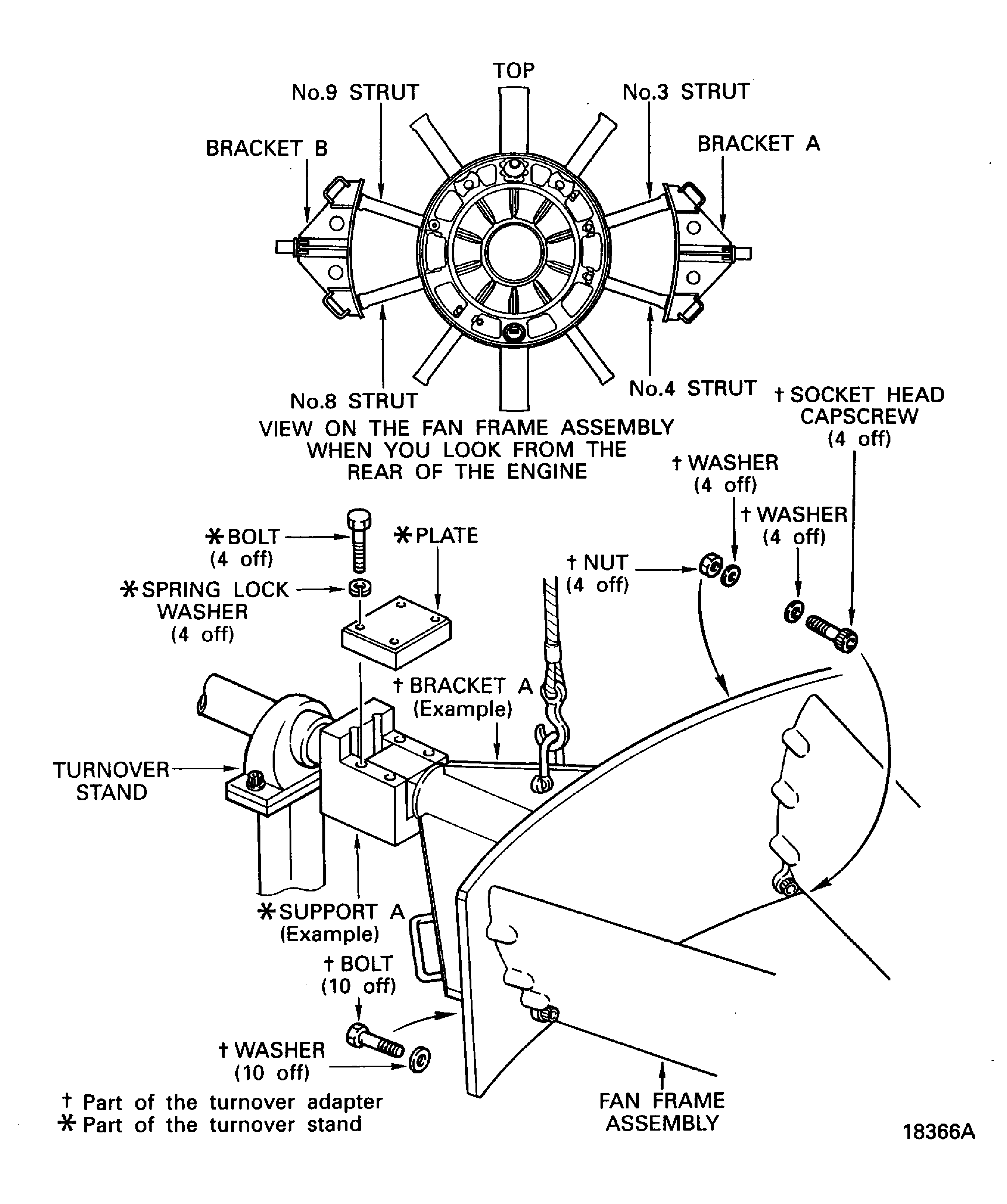 Do not tighten the bolts at this step.Align the 10 bolt holes in the bracket A with the 10 threaded holes in the No. 3 and No. 4 struts. Safety with the 10 bolts and washers (part of IAE 1J12317 Turnover adapter 1 off).