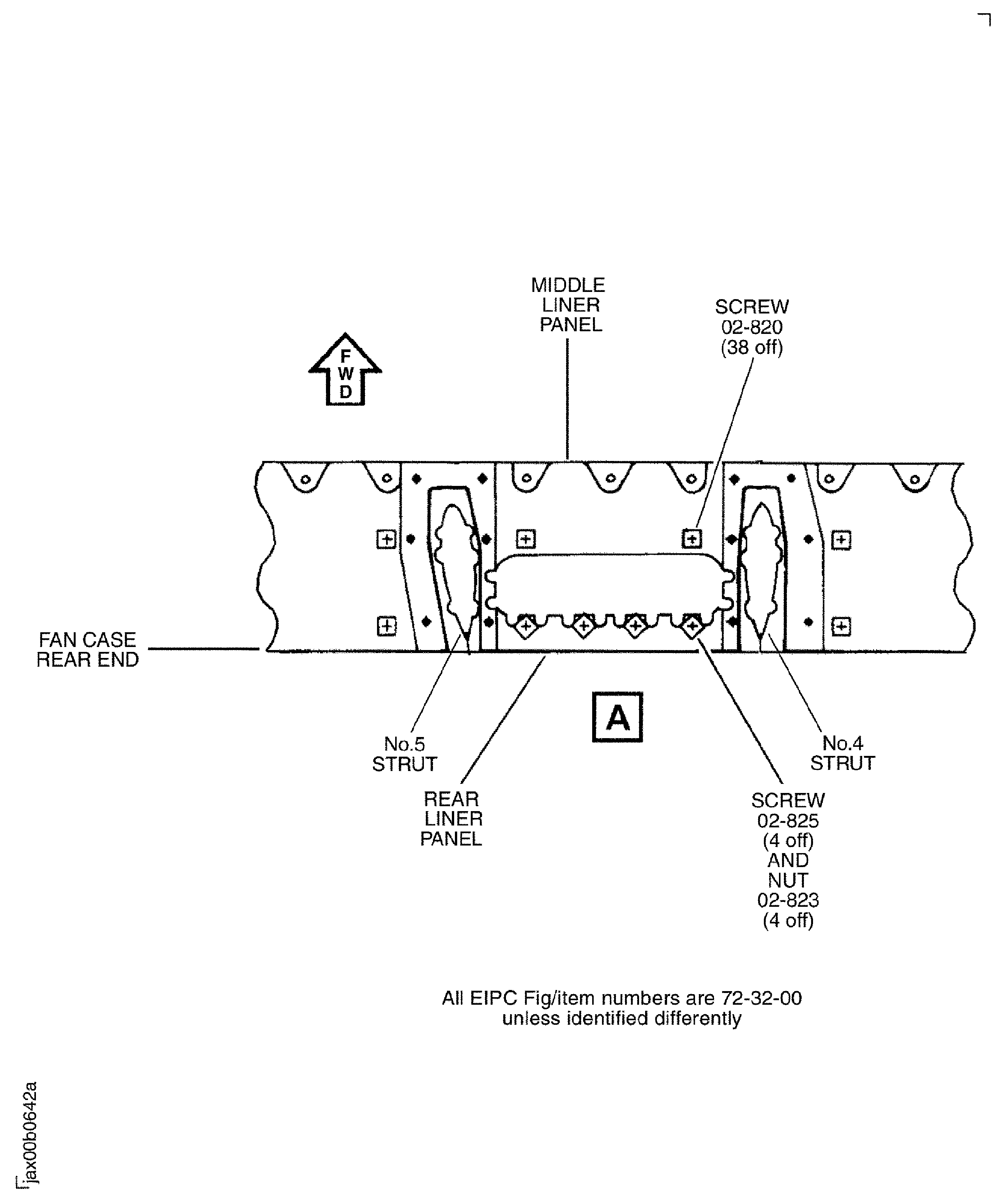 Figure: Position of the screws and the nuts which attach the rear liner panels, the middle liner panel and the front liner panels to the fan case