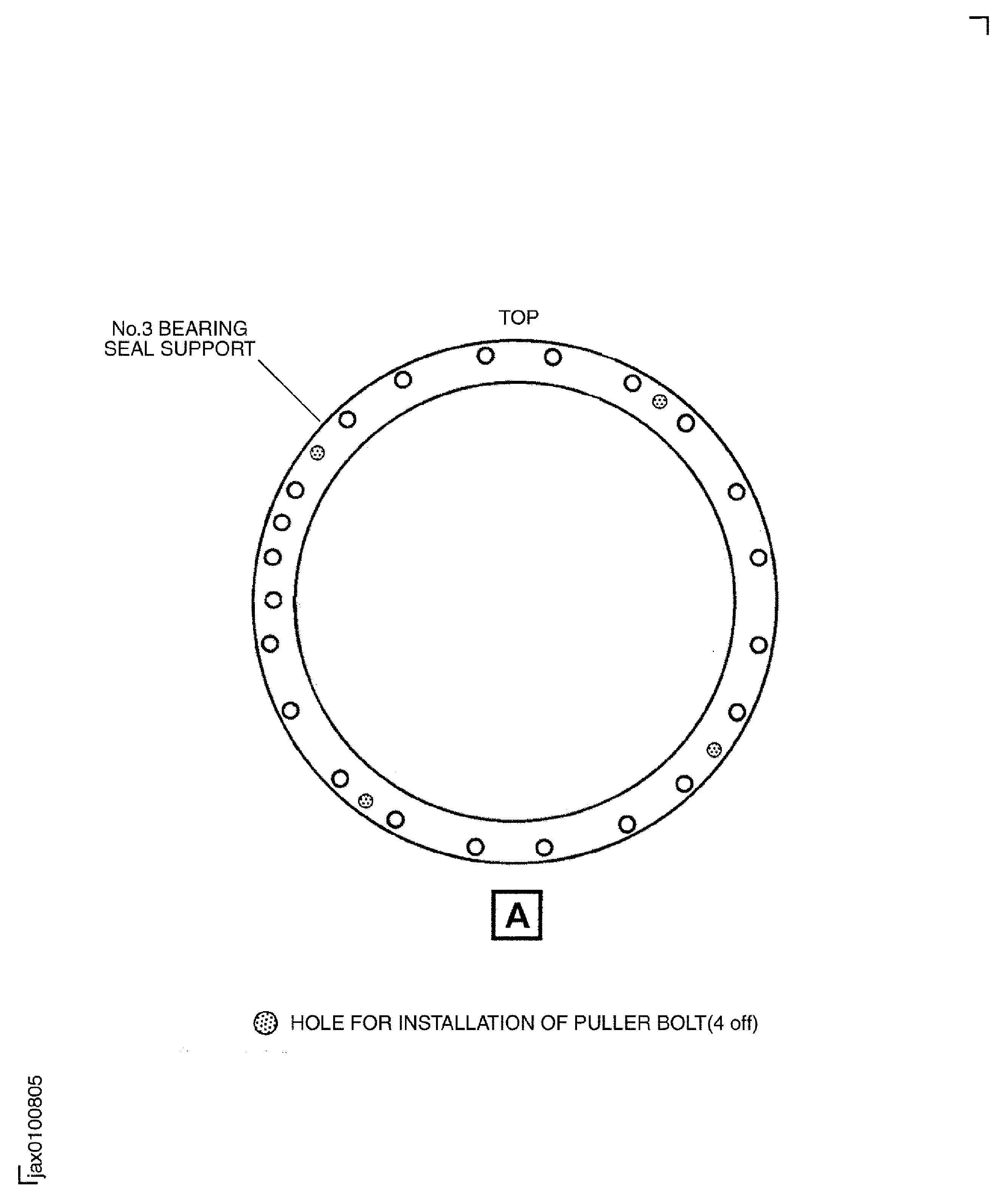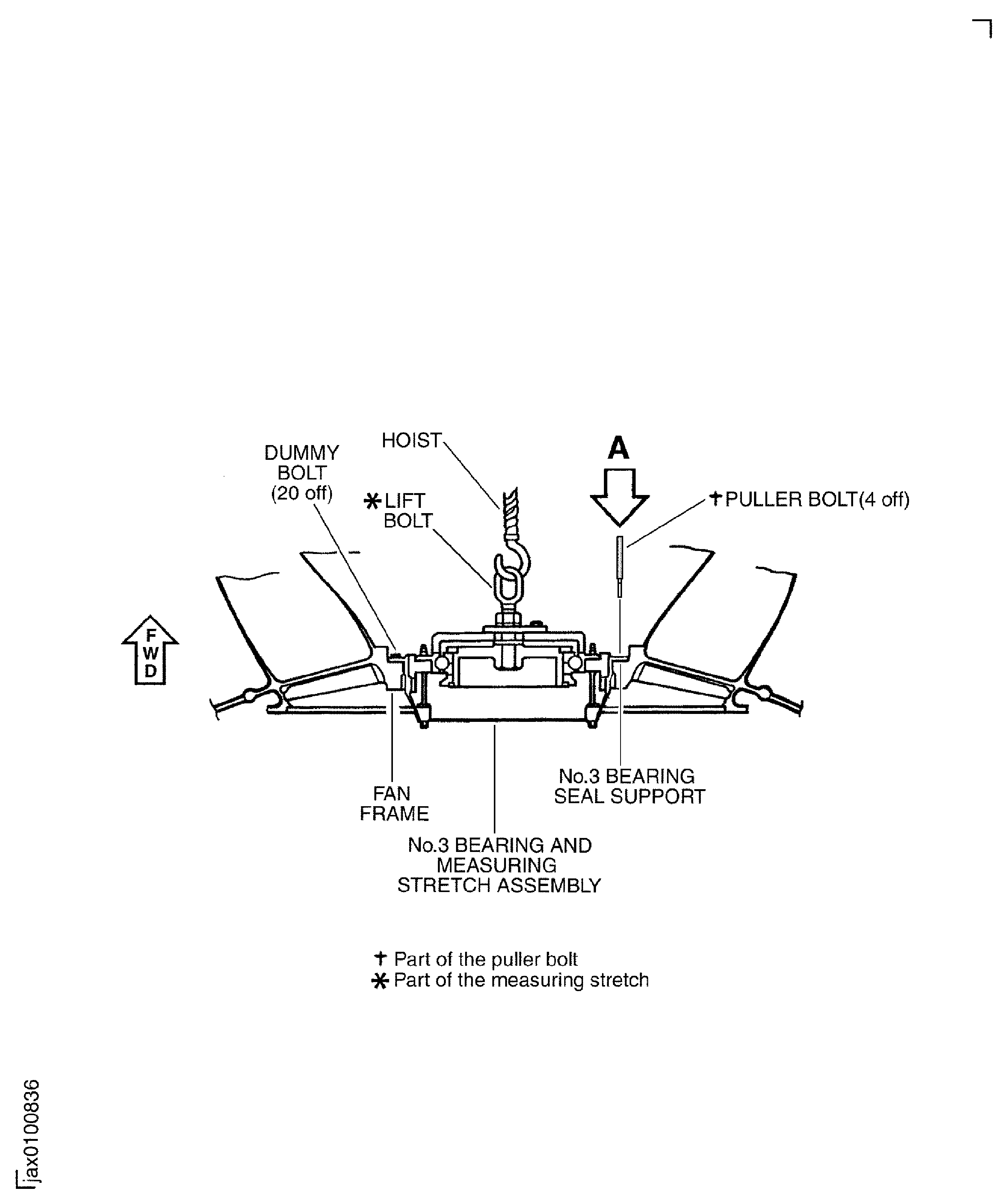 IAE 1J12021 Lifting spacer 1 off keeps the clearance between the flanges of the No. 3 Bearing Seal Assembly and the No. 3 Bearing Seal Support Assembly to permit the installation of a tool when you lift the No. 3 Bearing Seal Assembly.Install IAE 1P17043 Knocker puller 1 off to the No. 3 Bearing Seal Assembly.