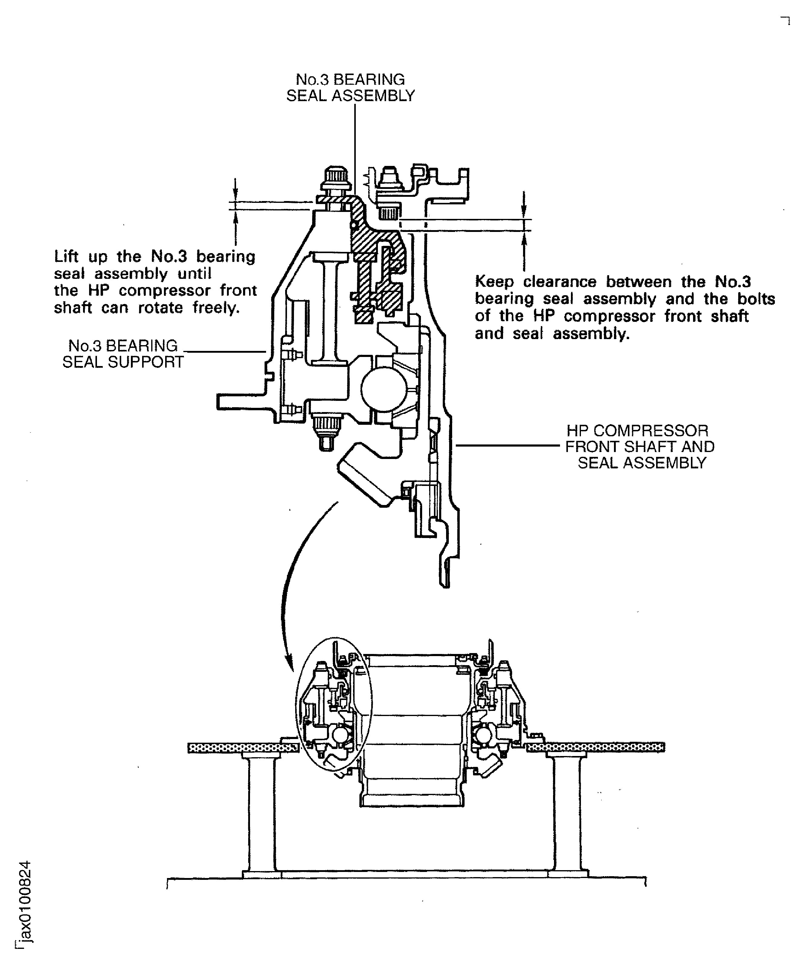 You cannot turn the HP Compressor front shaft by hand if the No. 3 Bearing Seal Assembly contacts the No. 3 Bearing Seal Seat.Clean the curvic coupling teeth on the swash check ring and the HP Compressor front shaft with a clean cloth made moist with CoMat 01-124 ISOPROPYL ALCOHOL.
