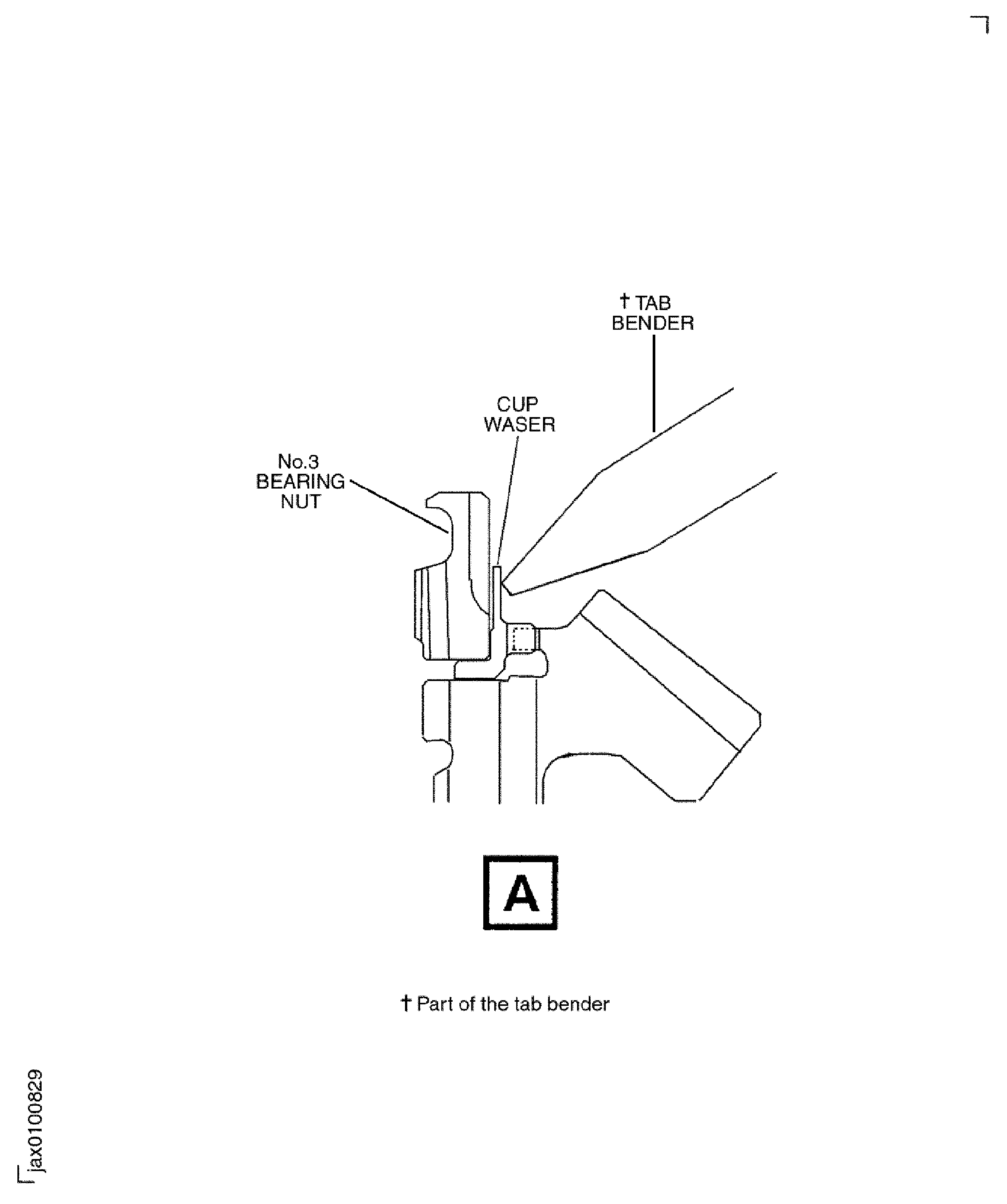 Bend the front part of the cup washer into the groove of the No. 3 Bearing nut with the tab bender (Part of IAE 1J12367 Tab bender 1 off).