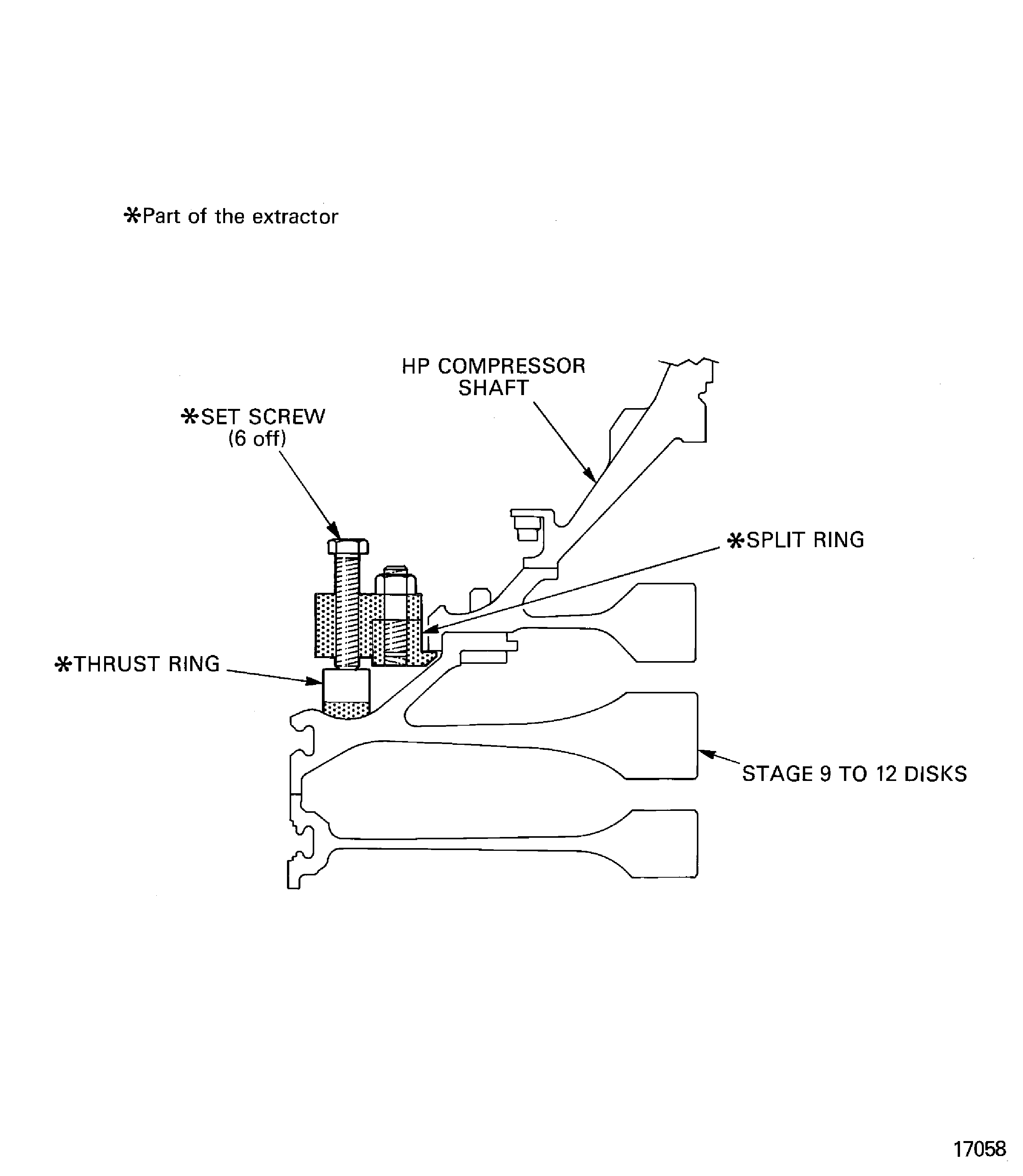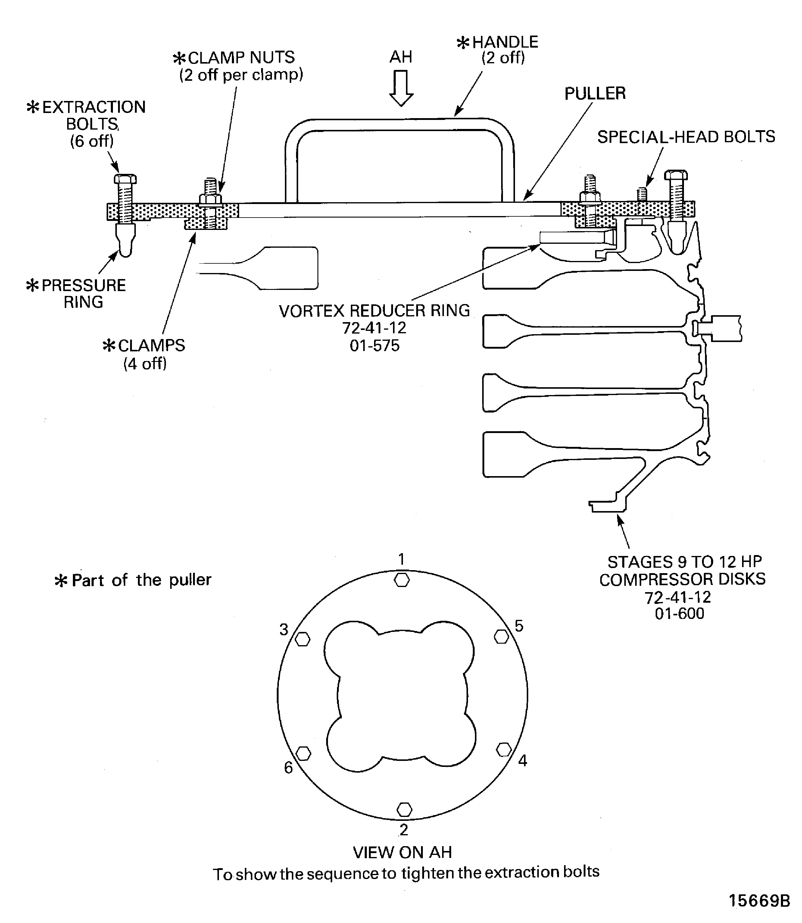 THE EXTRACTION BOLTS MUST BE TIGHTENED IN SEQUENCE AND NOT MORE THAN ONE TURN AT A TIME. IF YOU DO NOT TIGHTEN THE EXTRACTION BOLTS IN SEQUENCE OR IF YOU TURN MORE THAN ONE AT A TIME, YOU CAN CAUSE DAMAGE TO THE EQUIPMENT/MATERIALS.Tighten the six extraction bolts in small increments until the vortex reducer ring is released from the stage 9 disk.