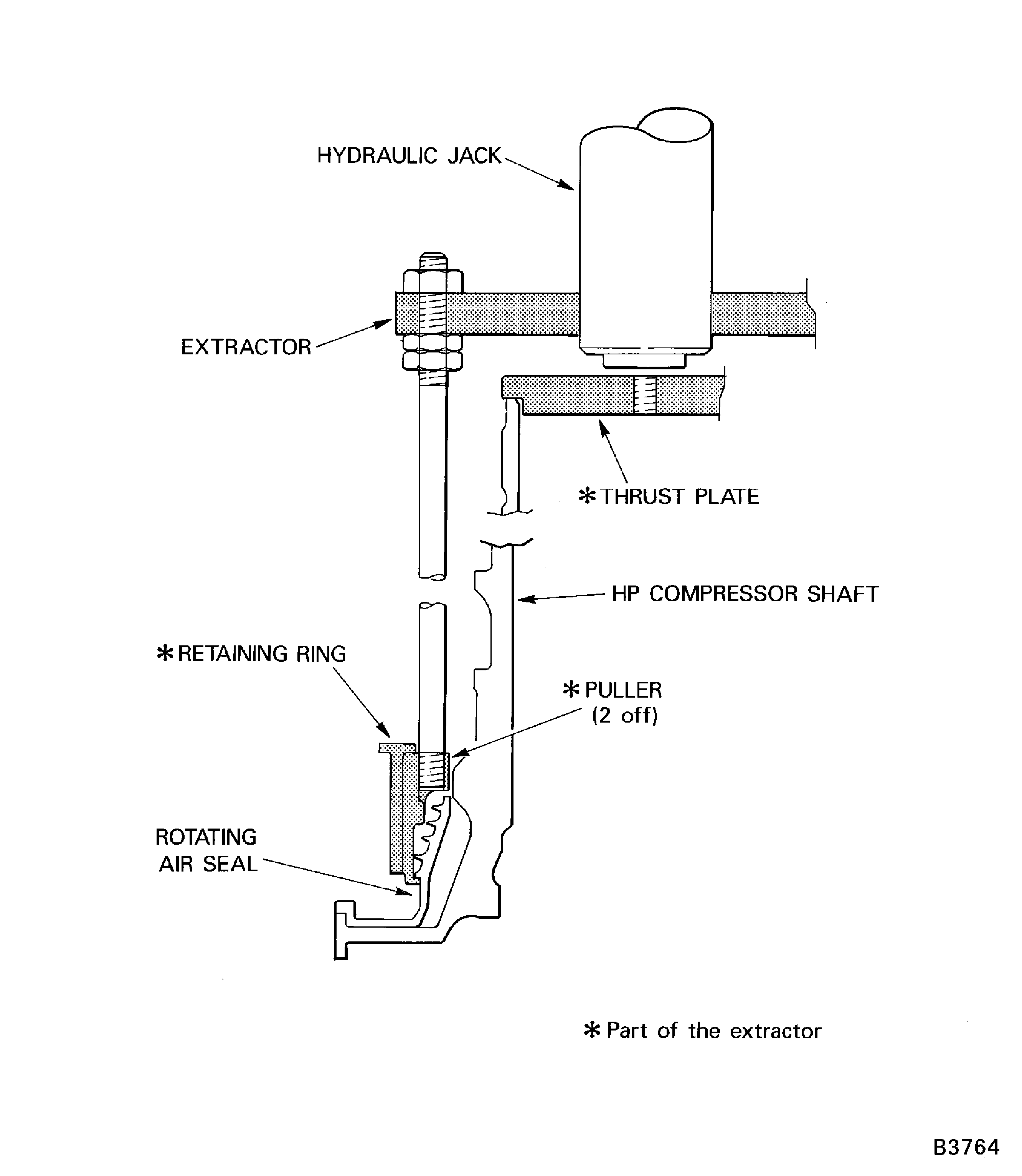 Install the ENERPAC 102 hydraulic jack 1 off in to the extractor and with IAE 1F10026 Hydraulic hand pump 1 off slowly remove the rotating air seal. Put the rotating air seal on to an applicable surface.