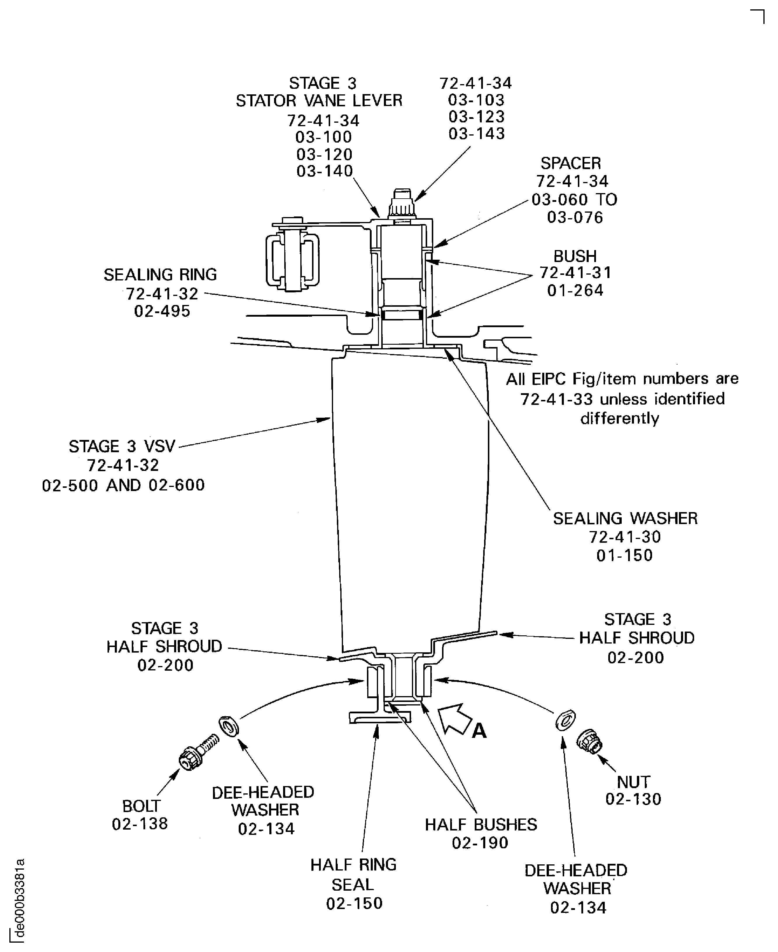 Pre SBE 72-0410: Remove the eight bolts, the 16 washers and the eight nuts which attach the stage 3 front and rear half shroud, the half bushes and the stage 3 front half seal ring to the stage 3 stator vanes at the inner pivot points.