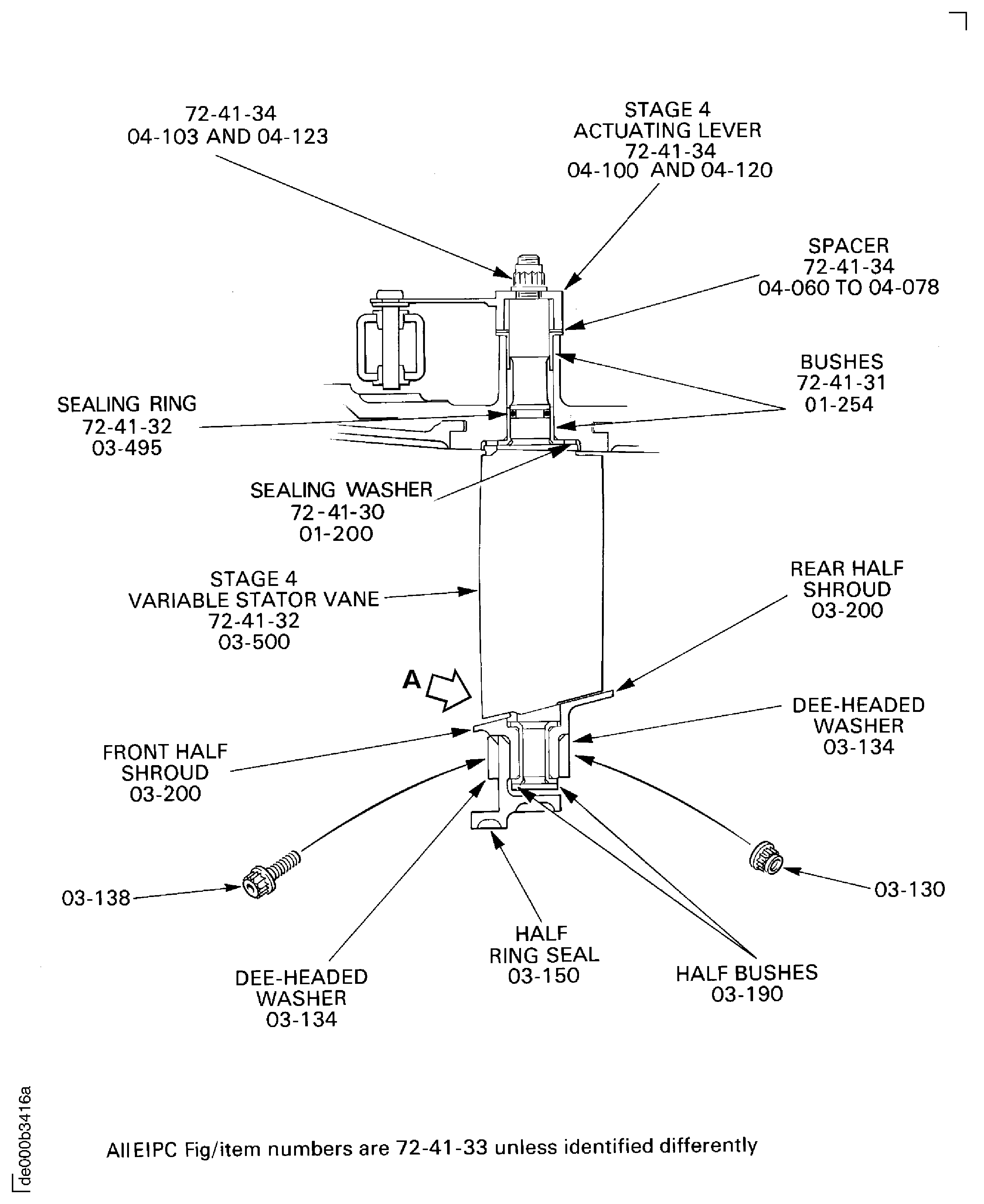 Pre SBE 72-410: Remove the 12 bolts, 24 washers and the 12 nuts which attach the stage 4 half shroud, the half bushes and the stage 4 half seal ring to the stage 4 stator vanes at the inner pivot point.