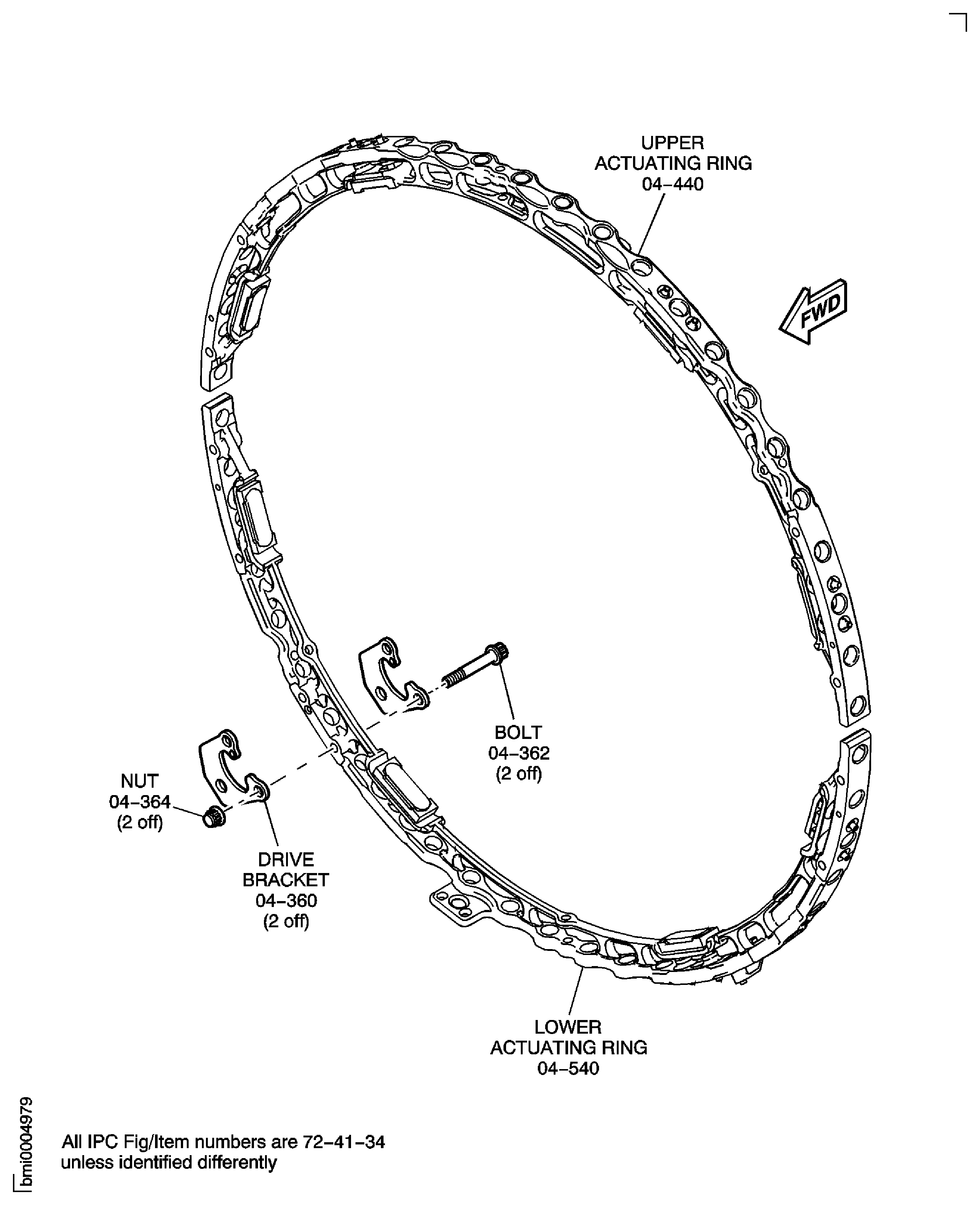 Set the stage 4 upper actuating ring adjacent to the stage 4 stator vane at positions 1 to 25.Put the stage 4 lower actuating ring HPC Variable Stator Vane Actuation System (72-41-34, 04-540) into position on the lower half HP Compressor front case. Install three of IAE 1R18423 Rigging pin 3 off or IAE 1R18894 Rigging pin 3 off to attach the stage 4 lower actuating ring to the lower half HP Compressor front case.