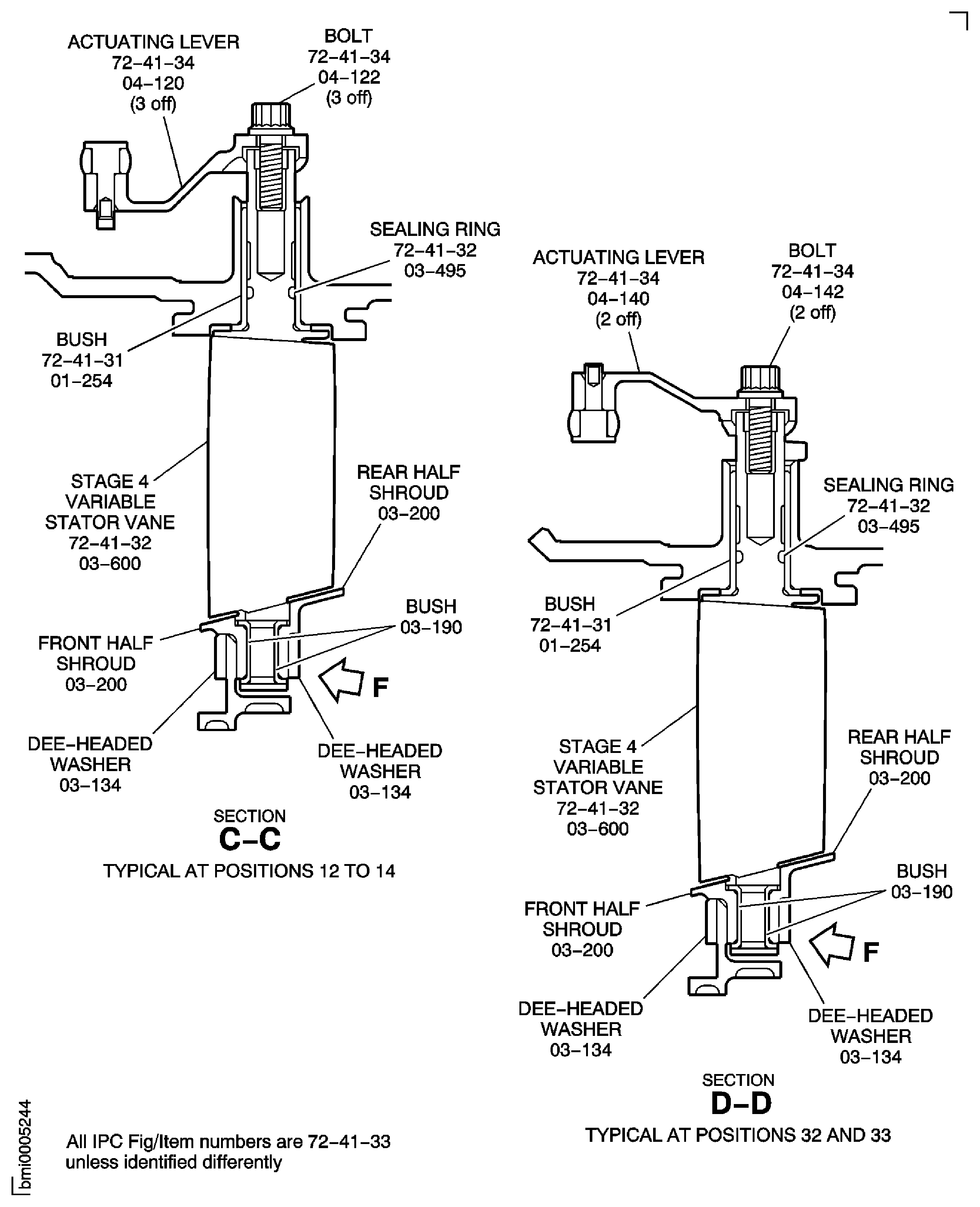 The two stage 4 stator vanes HPC Variable Stator Vanes (72-41-32, 03-600) with the short spindles must be installed at the positions 32 and 33.