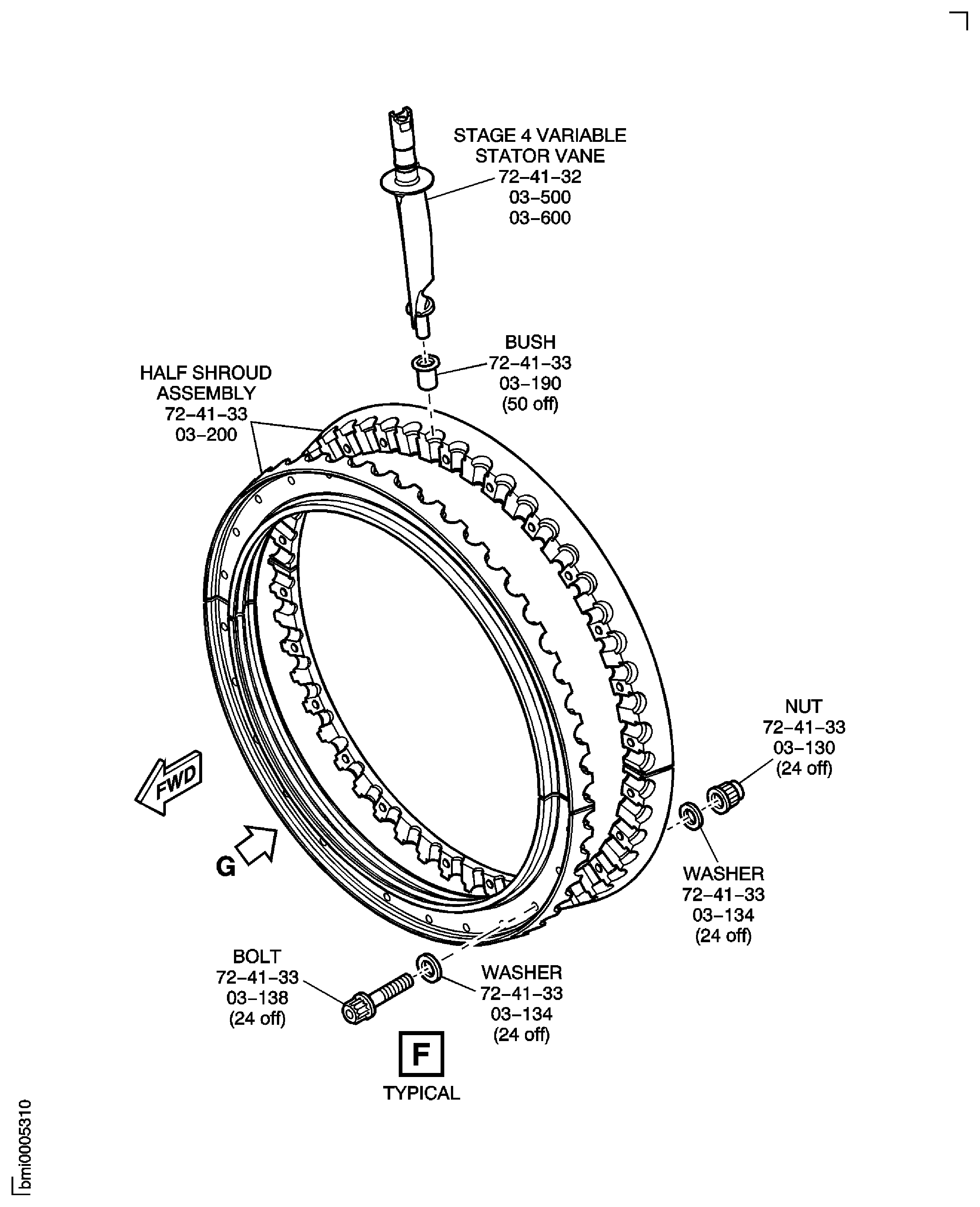 The HP Compressor stage 4 half shroud assembly consists of the front half shroud and rear half shroud as a matched set. Check correlation markings on the front and rear half shrouds to ensure that the stage 4 half shroud assembly will be installed as a matched set.Install the 25 bushes HPC Variable Stator Vane Shrouds And Related Part (72-41-33, 03-190) onto the stage 4 stator vanes.