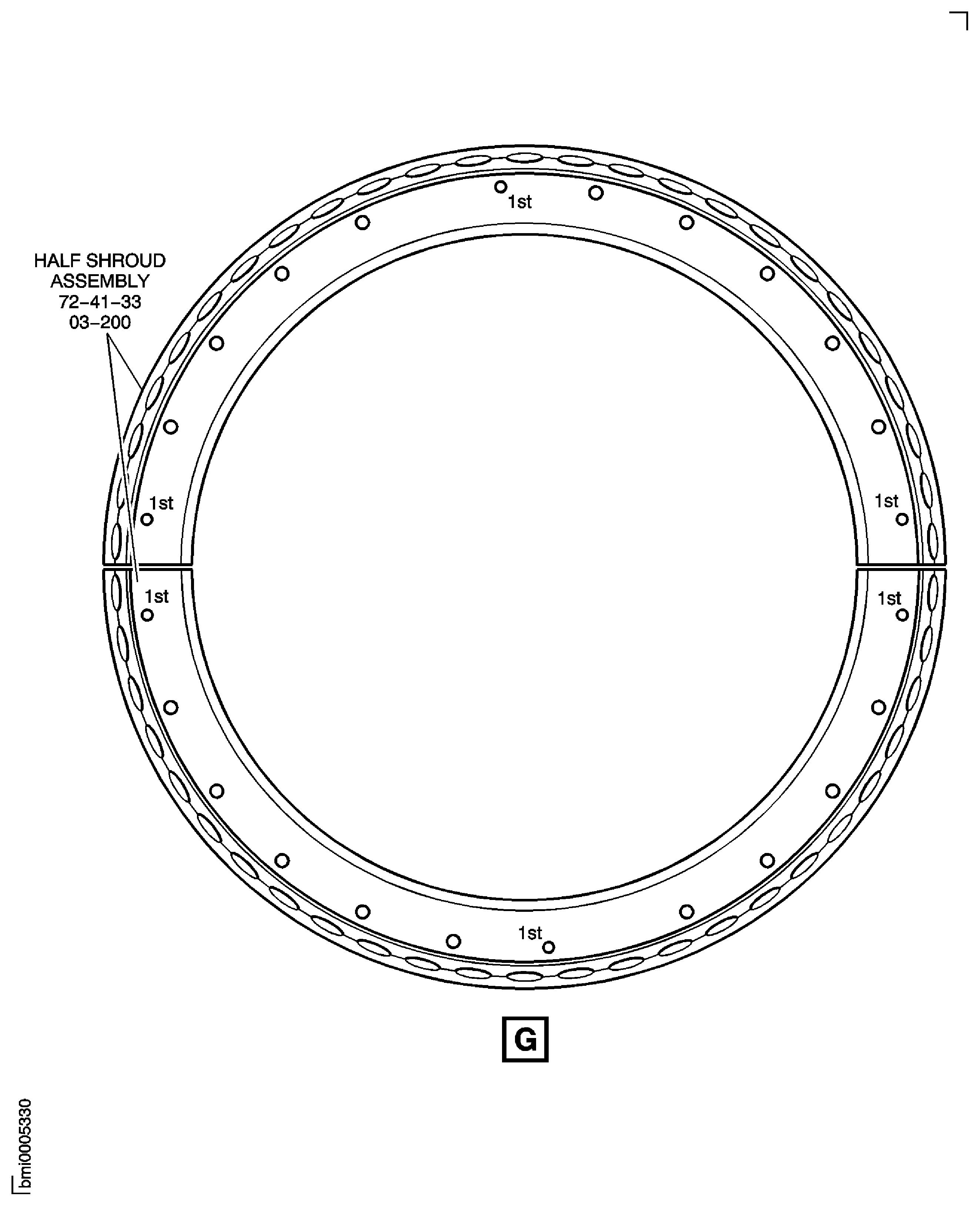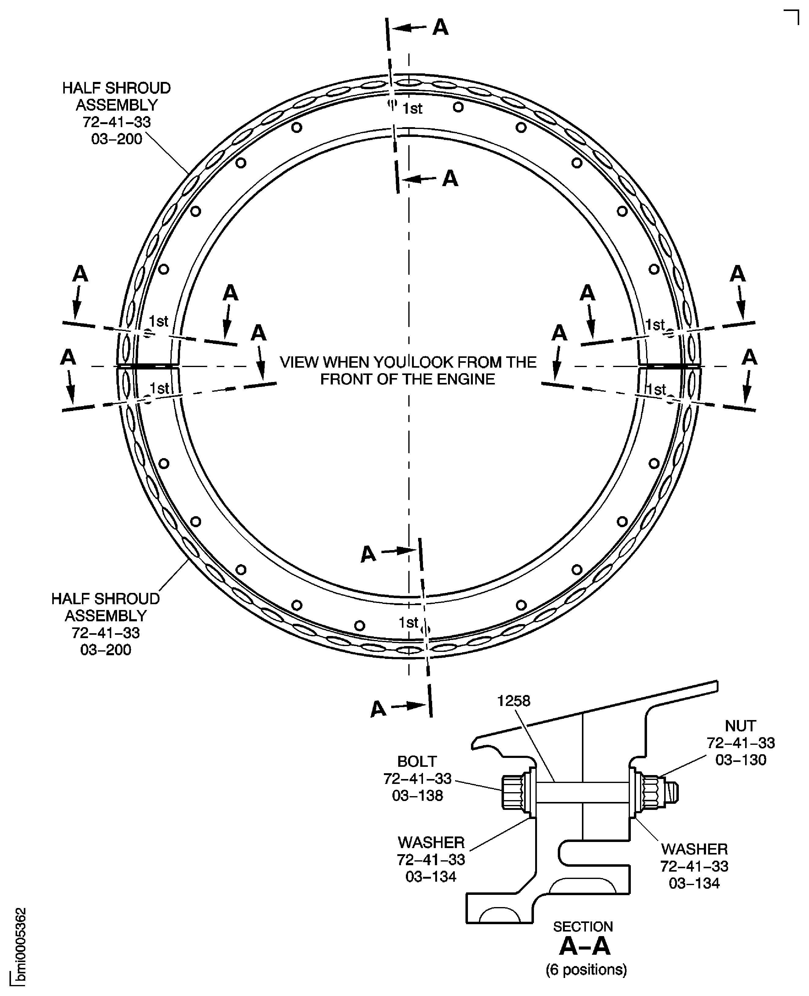 Install the three bolts HPC Variable Stator Vane Shrouds And Related Part (72-41-33, 03-138), the six dee-headed washers HPC Variable Stator Vane Shrouds And Related Part (72-41-33, 03-134) and the three nuts HPC Variable Stator Vane Shrouds And Related Part (72-41-33, 03-130) to the stage 4 half shroud assembly at the position marked First (1st) and tighten them.