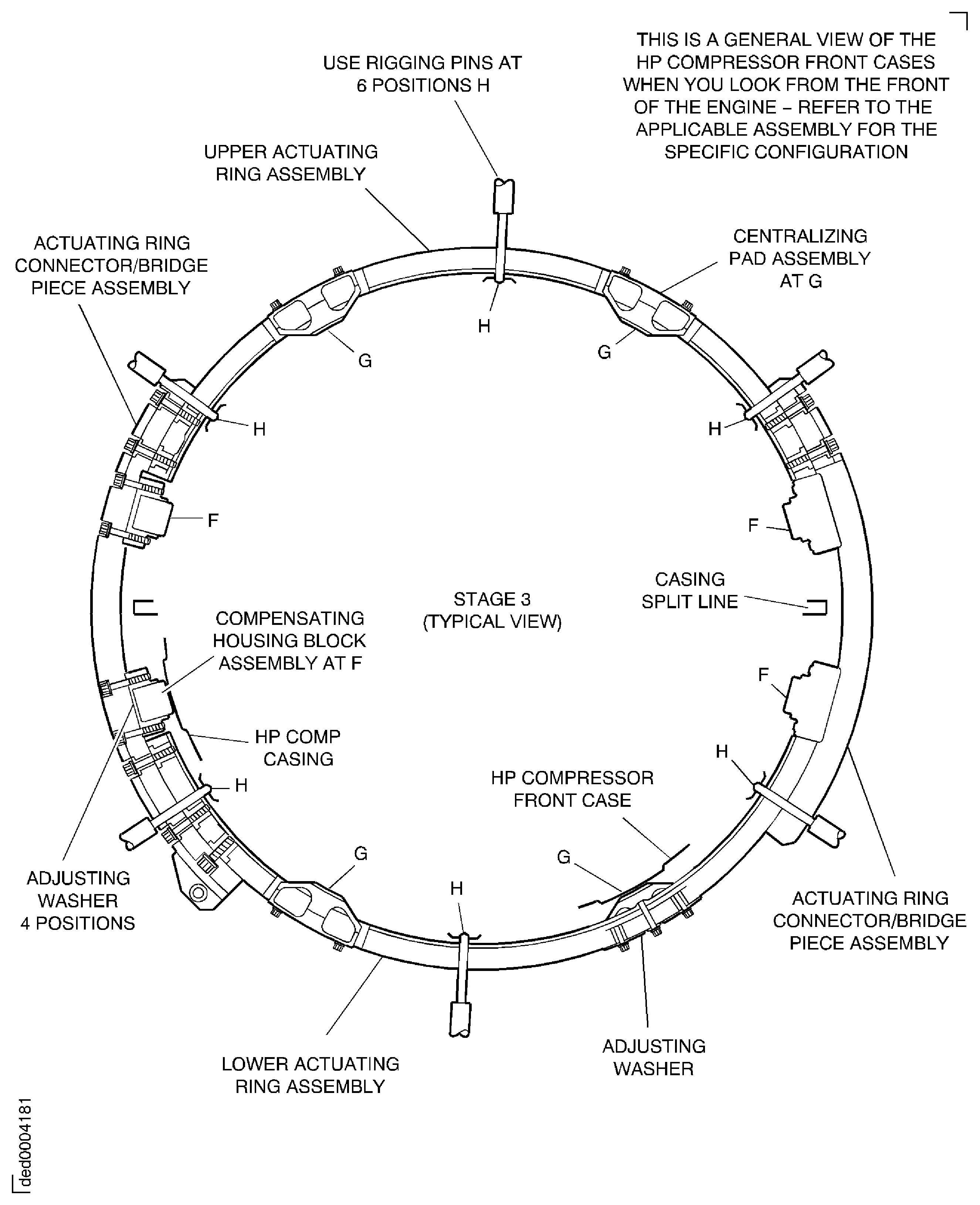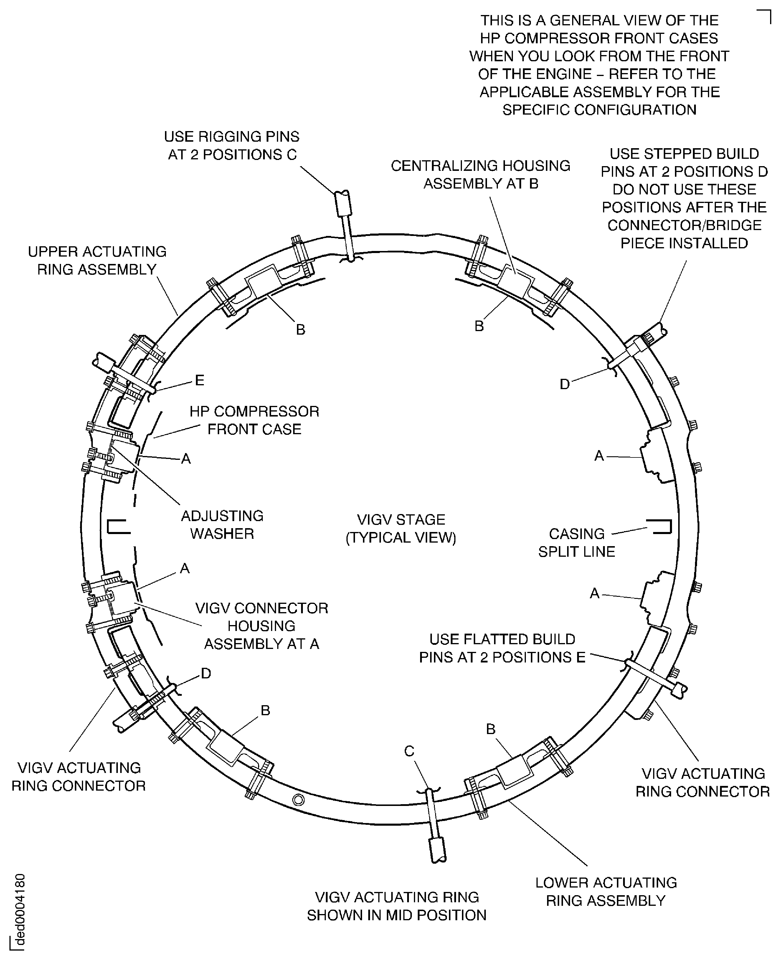 This TASK gives the general procedure to check and set the clearances between the HP compressor front cases (VIGV stage and stages 3 to 5) and the VSV upper and lower actuating ring assemblies, refer to Figure. Do this procedure when instructed to do so from the applicable build procedures during the assembly of the HP compressor front case. Refer to the following procedures.