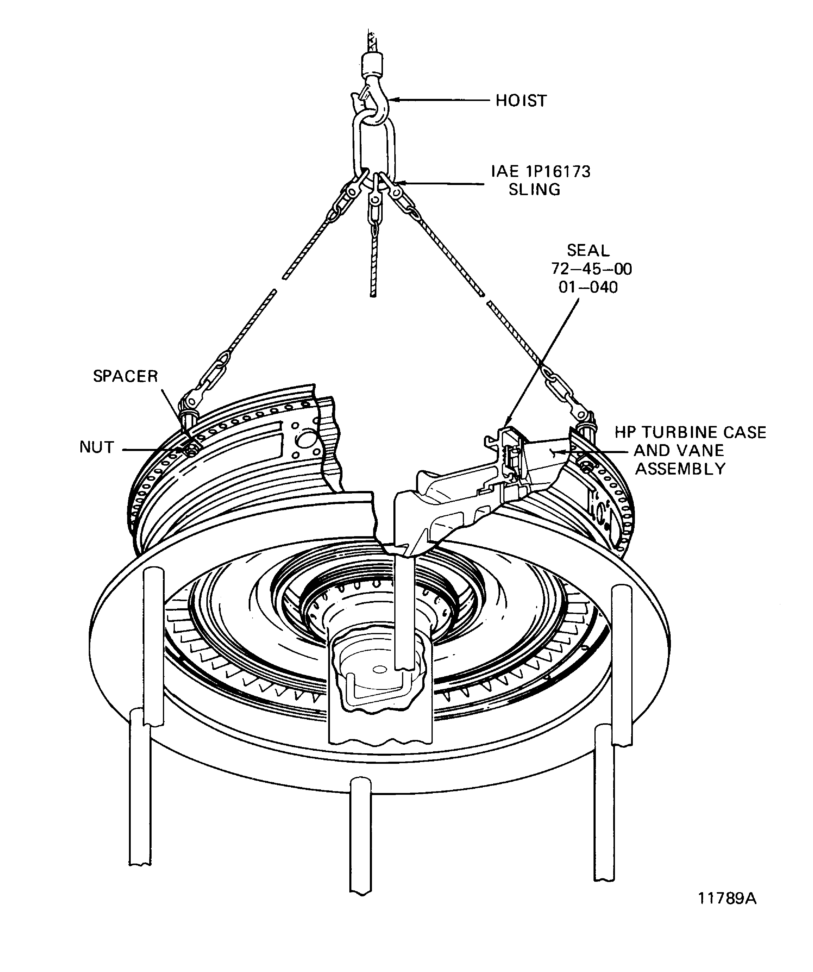 BE CAREFUL WHEN YOU INSTALL THE CASE AND VANE ASSEMBLY OVER THE STAGE 1 TURBINE ROTOR ASSEMBLY. DAMAGE TO THE KNIFE-EDGE SEALS ON THE STAGE 2 HPT AIR SEAL AND STAGE 1 HPT BLADE TIPS COULD OCCUR.Lower the case and vane assembly in to position over the Stage 1 Rotor Assembly. Remove the sling and the hoist from the case and vane assembly.