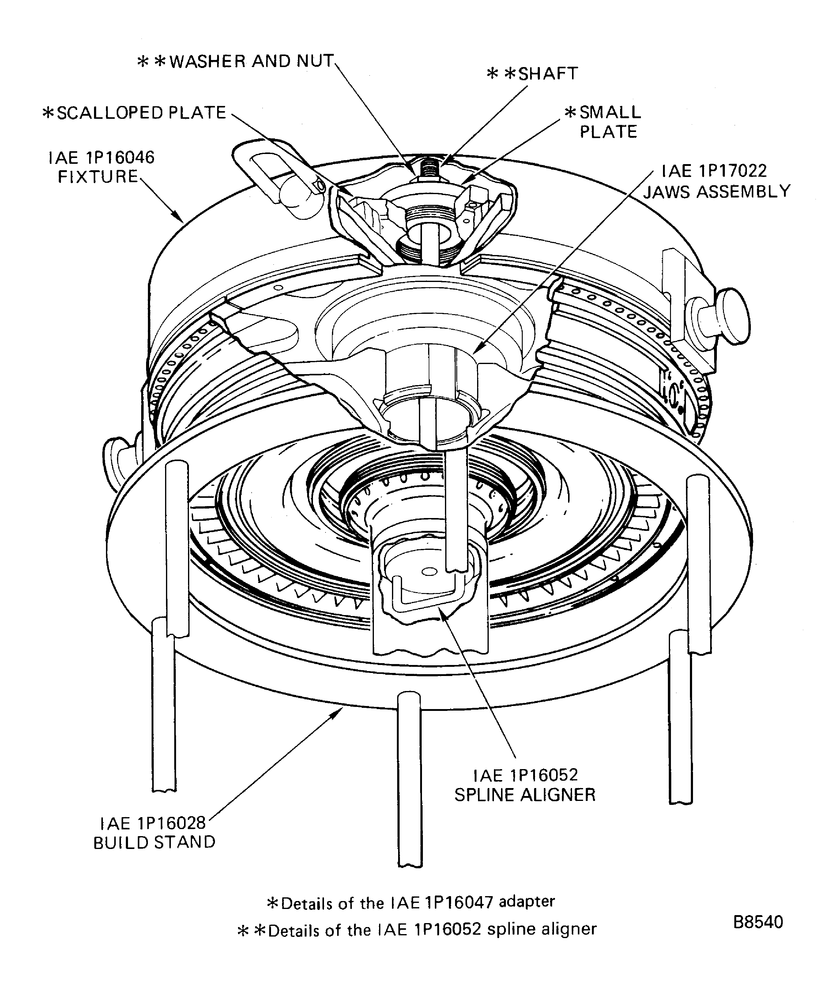 Install the shaft of the IAE 1P16047 Hydraulic adapter 1 off into the plug of the spline aligner in the center locator of the build stand, Figure.