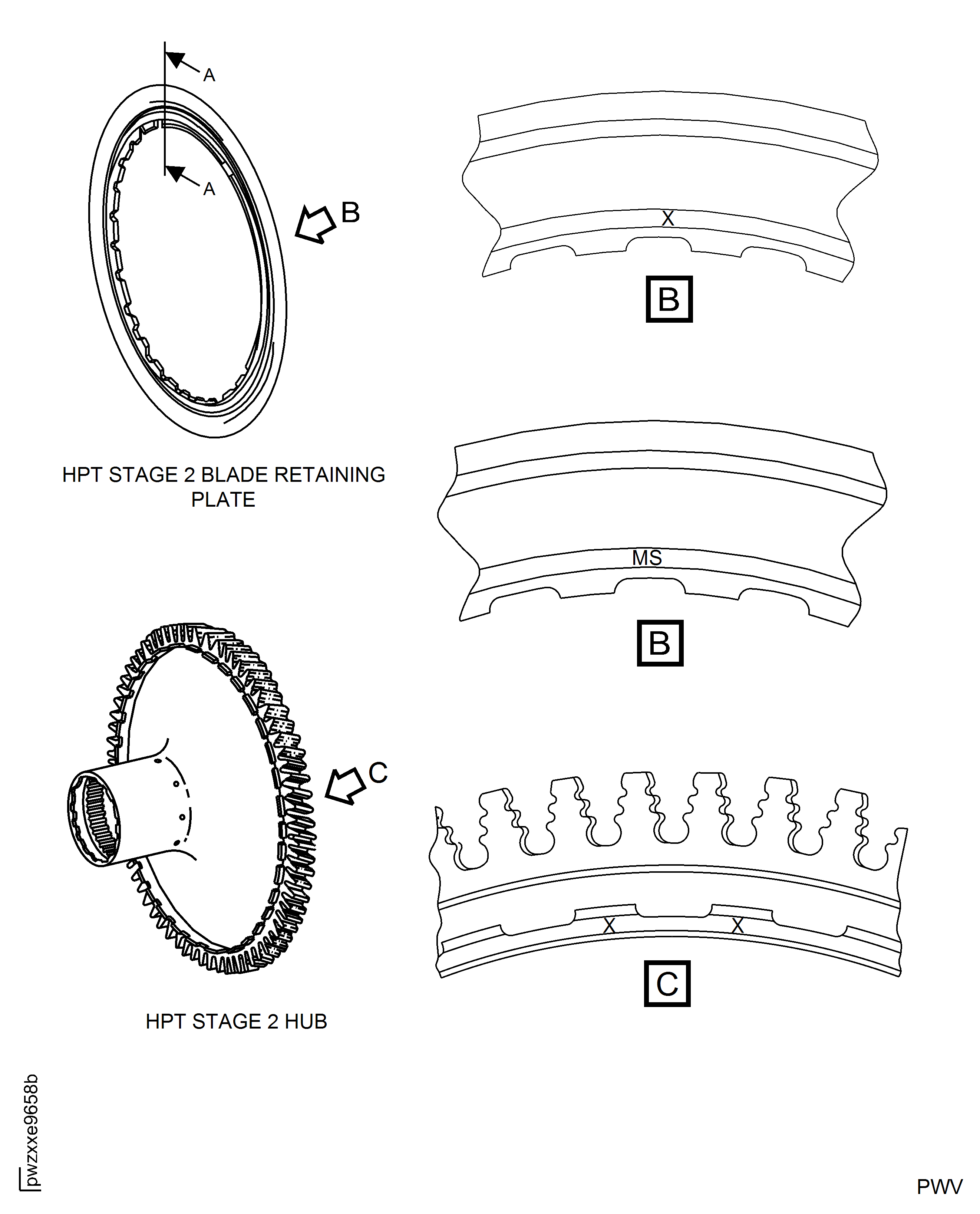 If HPT Stage 2 Retaining Plate has "X" or "MS" marked at the slot location do not install the retaining plate lock and key, another slot must be used.