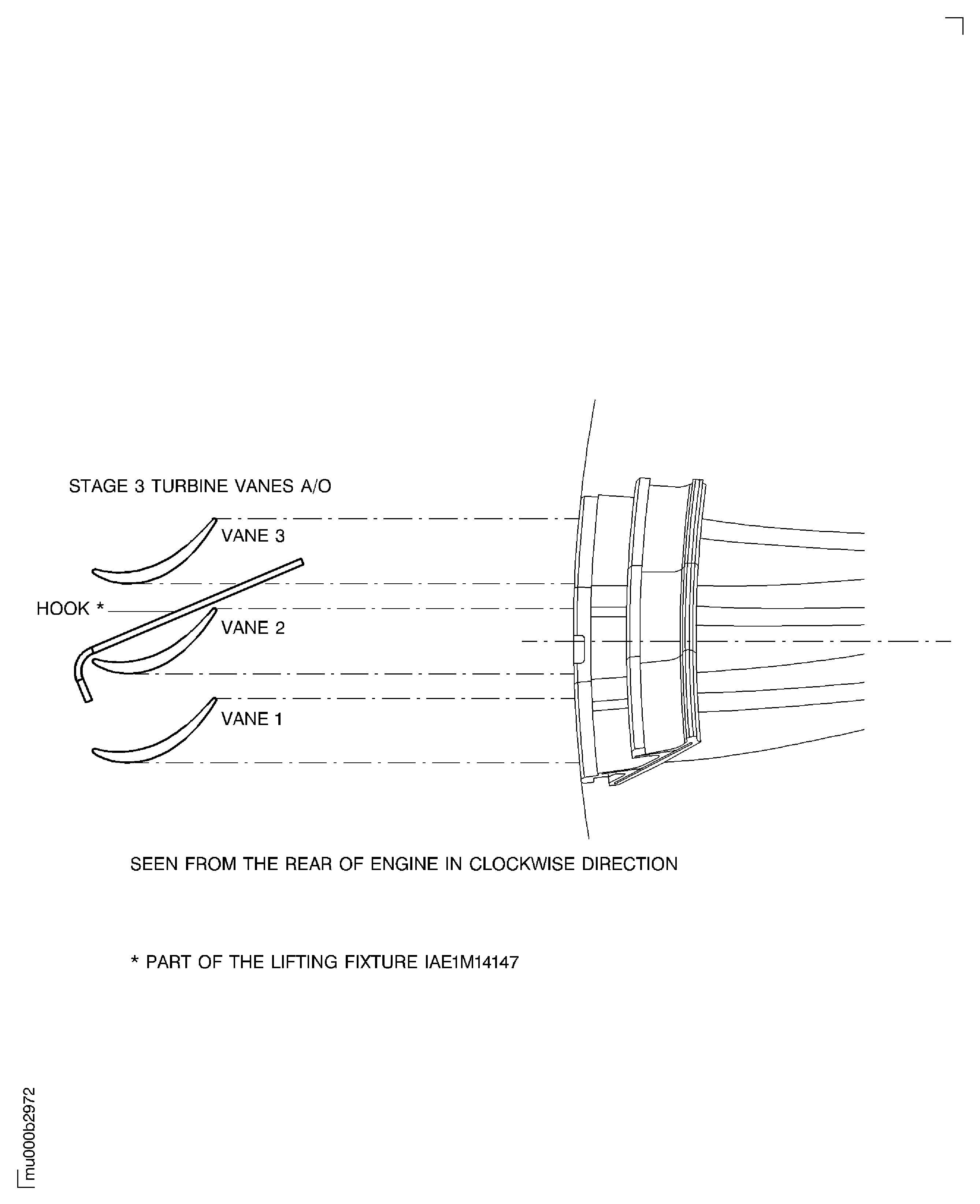 MAKE SURE THAT EACH TAIL OF THE HOOKS IS ATTACHED CORRECTLY TO THE STAGE 3 VANES. IF NOT THE PARTS CAN BE DAMAGED. THE HOOKS CAN BE SEEN THROUGH THE APERTURE OF THE LIFTING FIXTURE.Push the 15 hooks down. Turn the hooks by 90 degrees so that they engage the front edges of the second vane airfoils.
