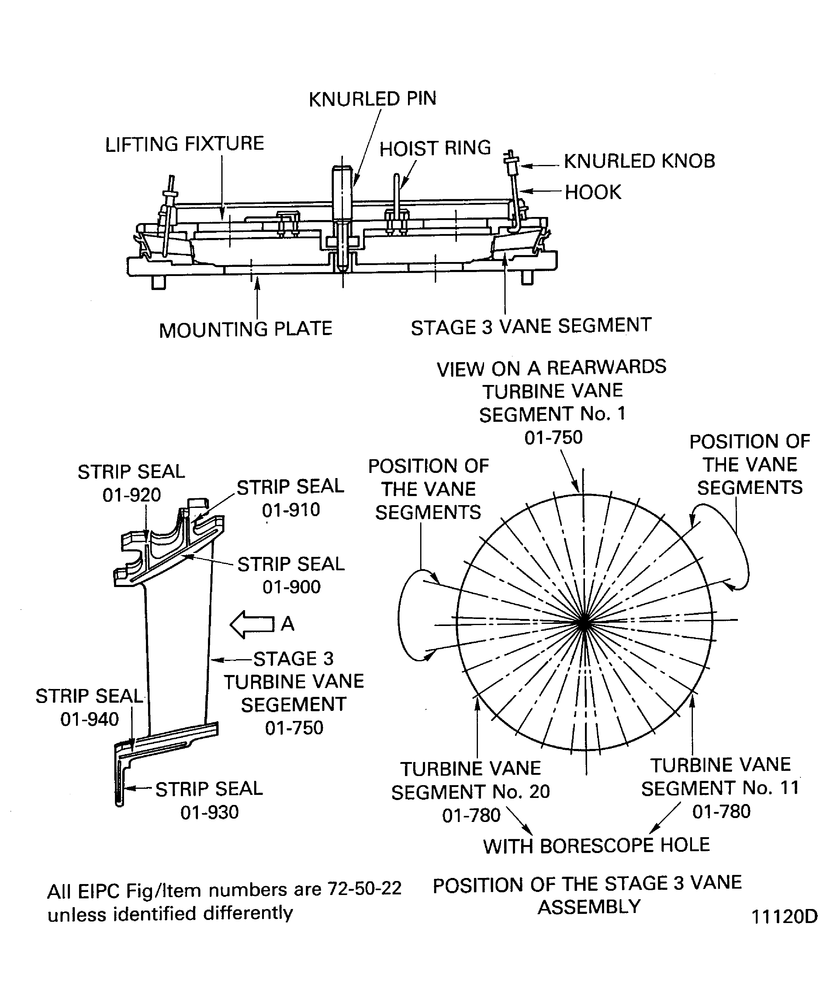 Make sure that all the strip seals are correctly installed in the grooves of the stage 3 vane segments.Install the five strip seals in the right grooves of the inner and outer platform of all the vane segments. Use CoMat 10-062 ASSEMBLY FLUID.